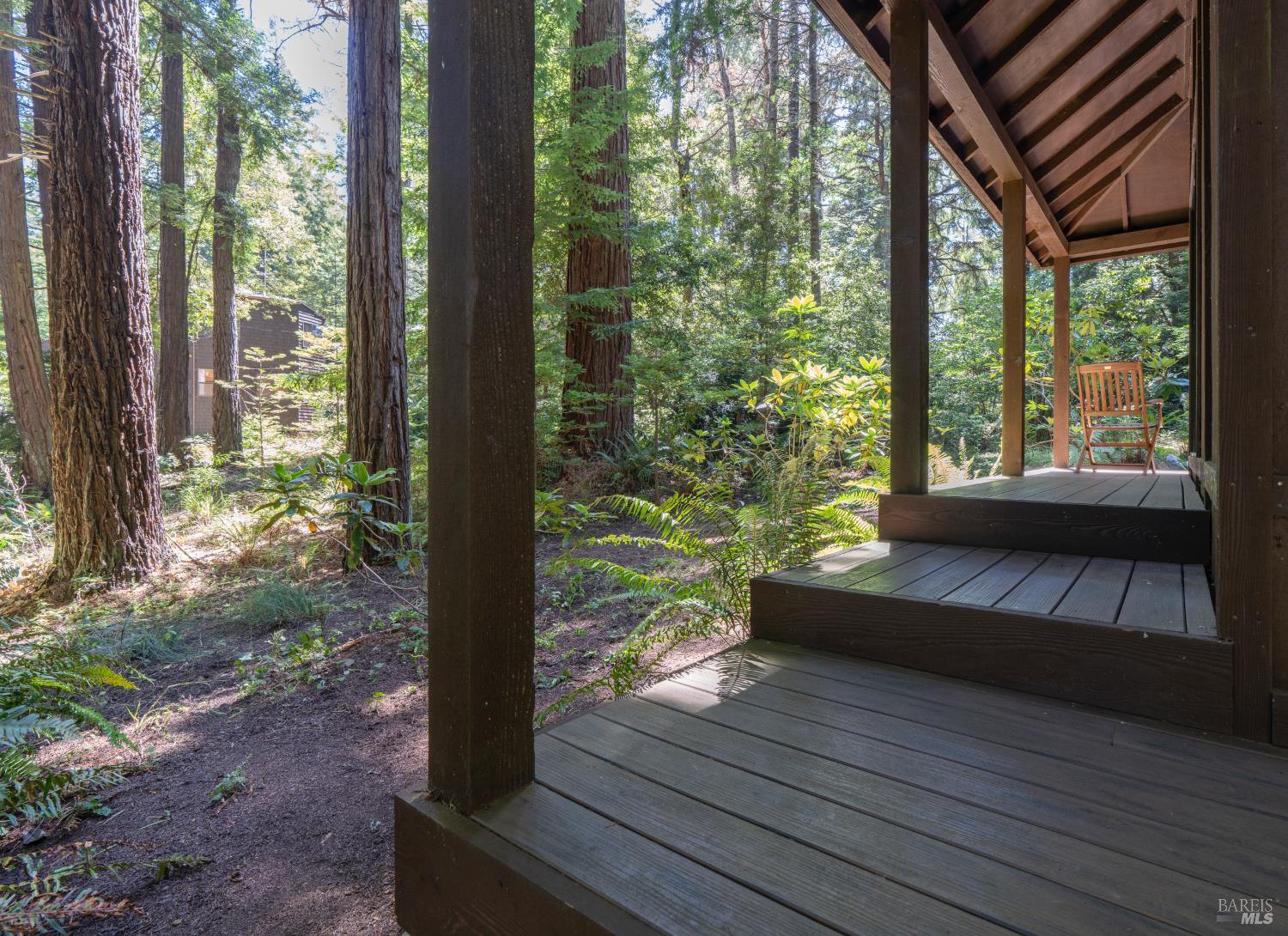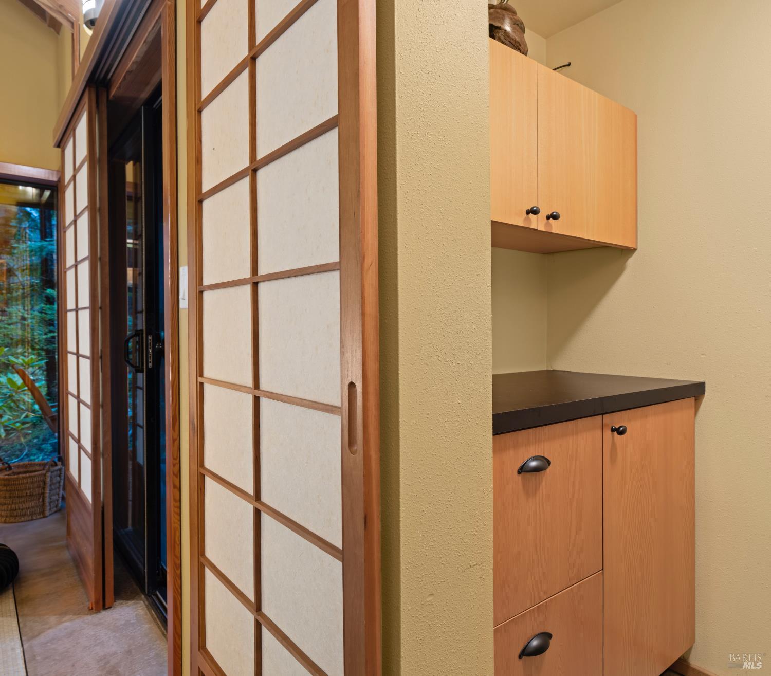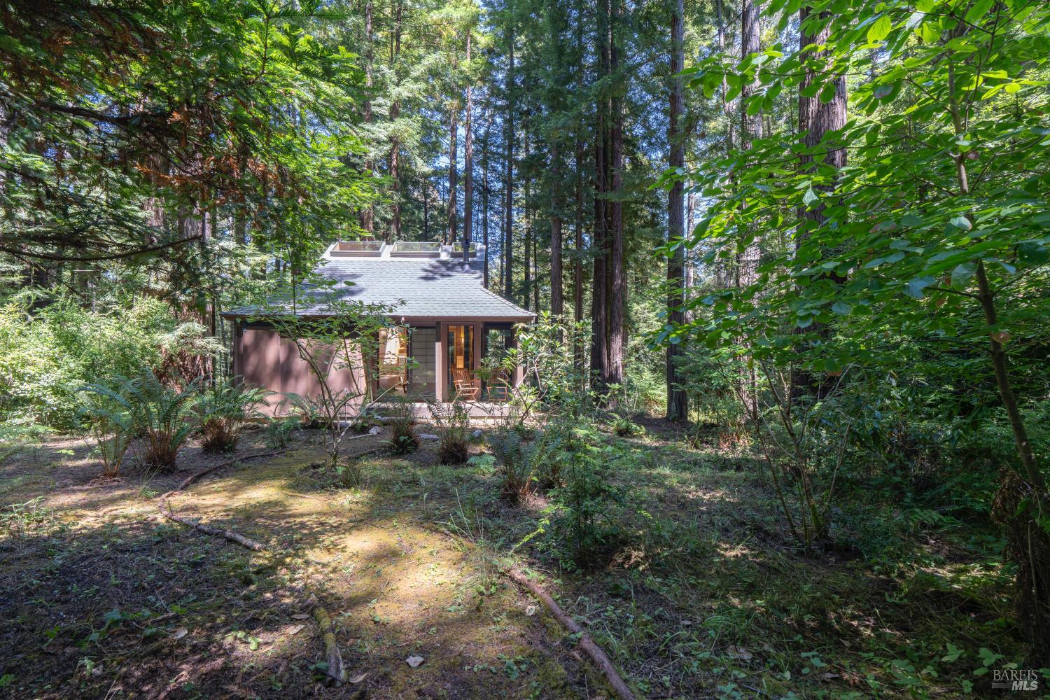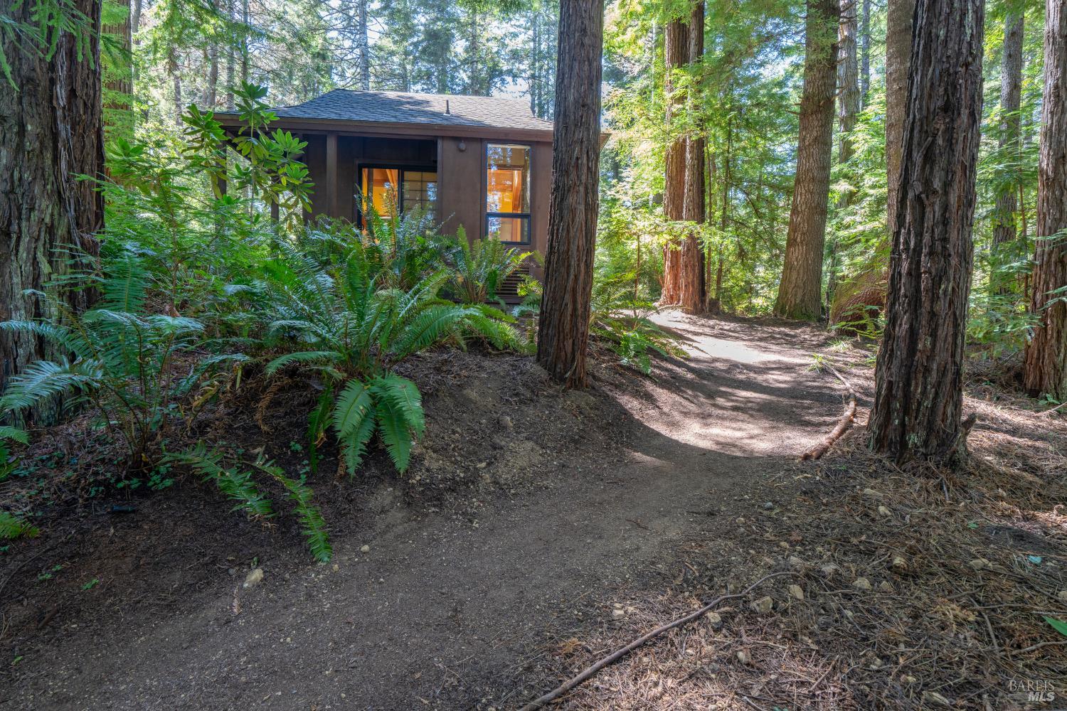 Follow your path through a calming walking experience of the forest before reaching the Tea House. Tea House is a weekend retreat of approximately 384 square foot size with a Japanese aesthetic. Inspired by tea house tradition inside and out, it's an exquisite example of making multiple uses out of a single space by distilling needs down to what really matters. By using alcoves, shoji screens, and a tokonoma it elegantly accommodates living, dining, kitchen, and sleeping all centered on a traditional tatami mat floor. The tiny building appears lifted into place among the redwood trees. Designed by local Architect Fiona E. O'Neill, a one woman-owned firm designing homes at The Sea Ranch since 1991.