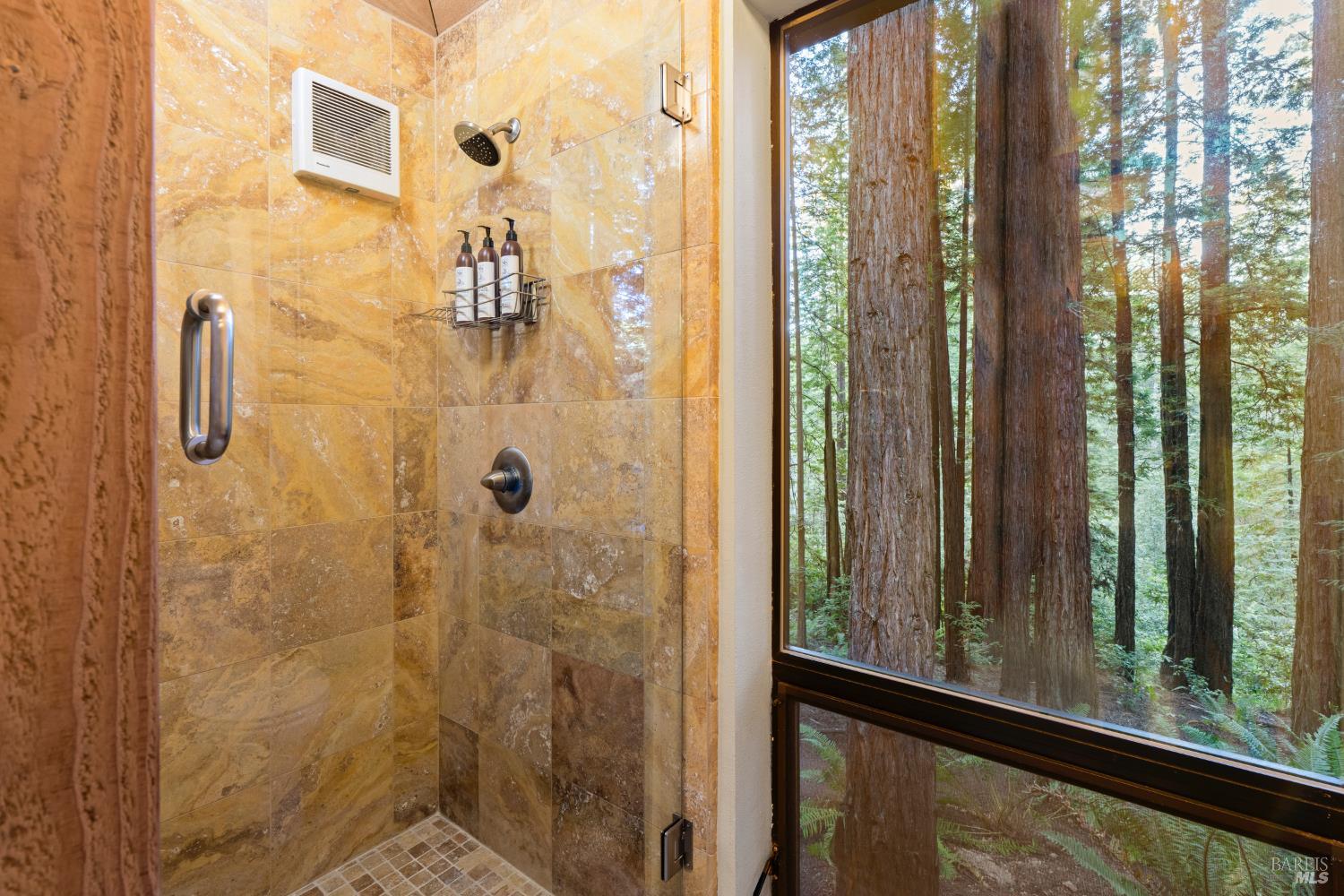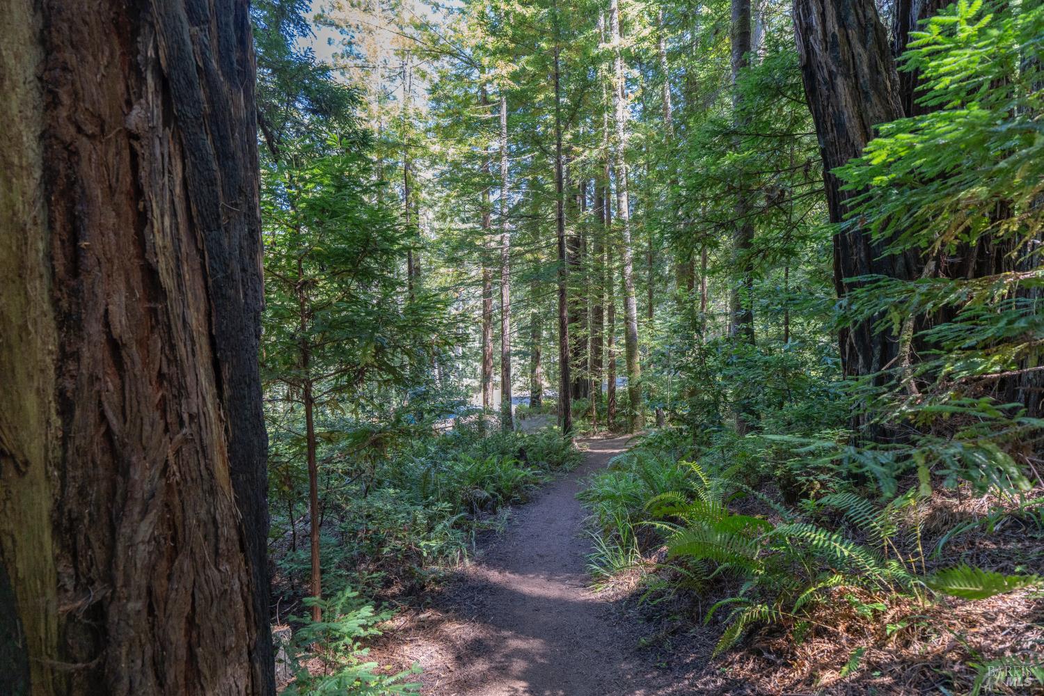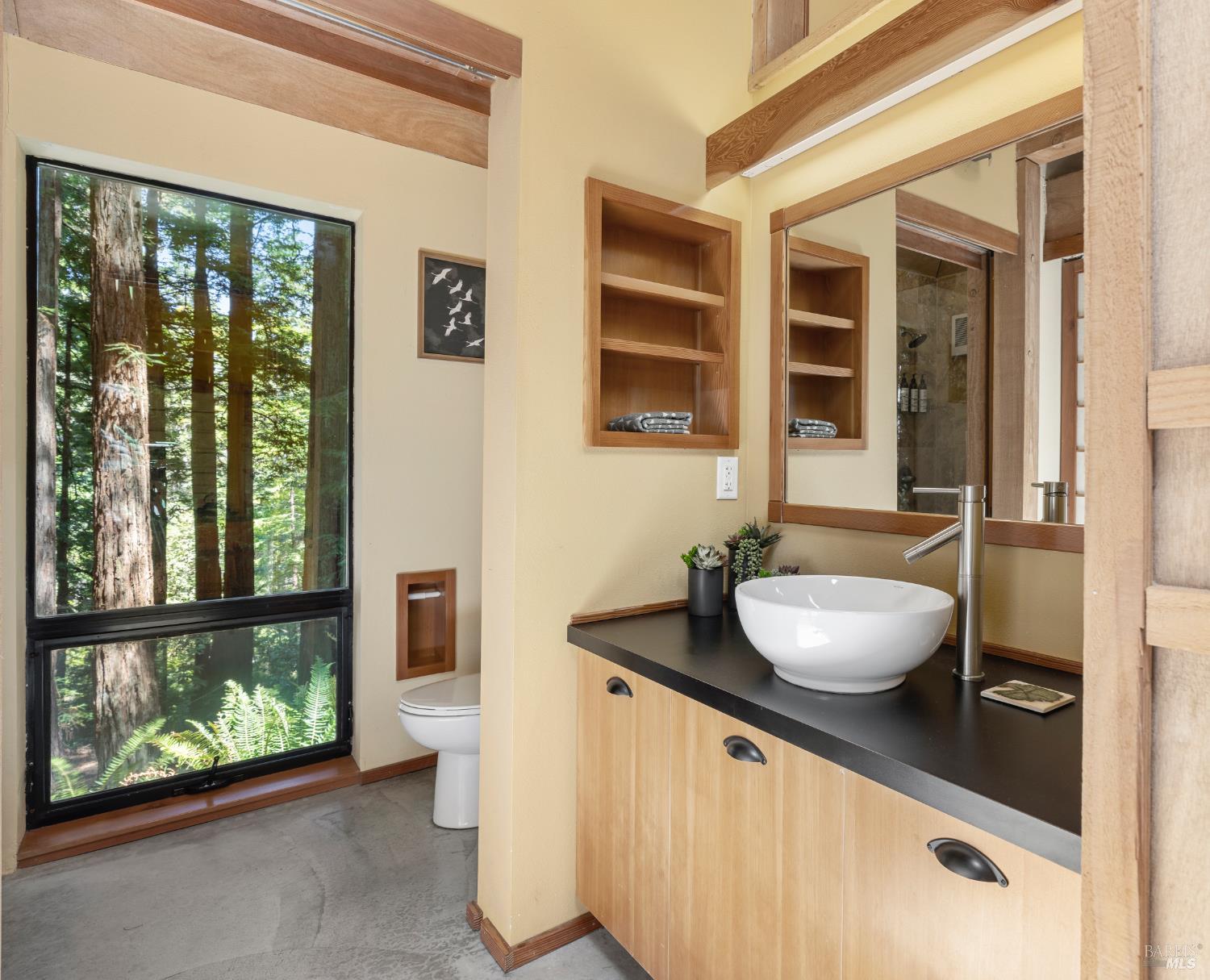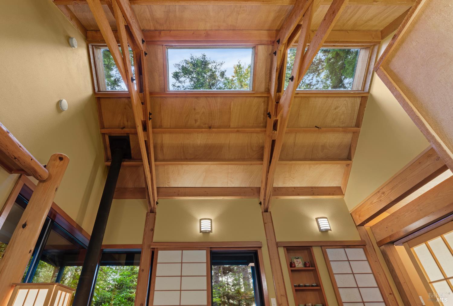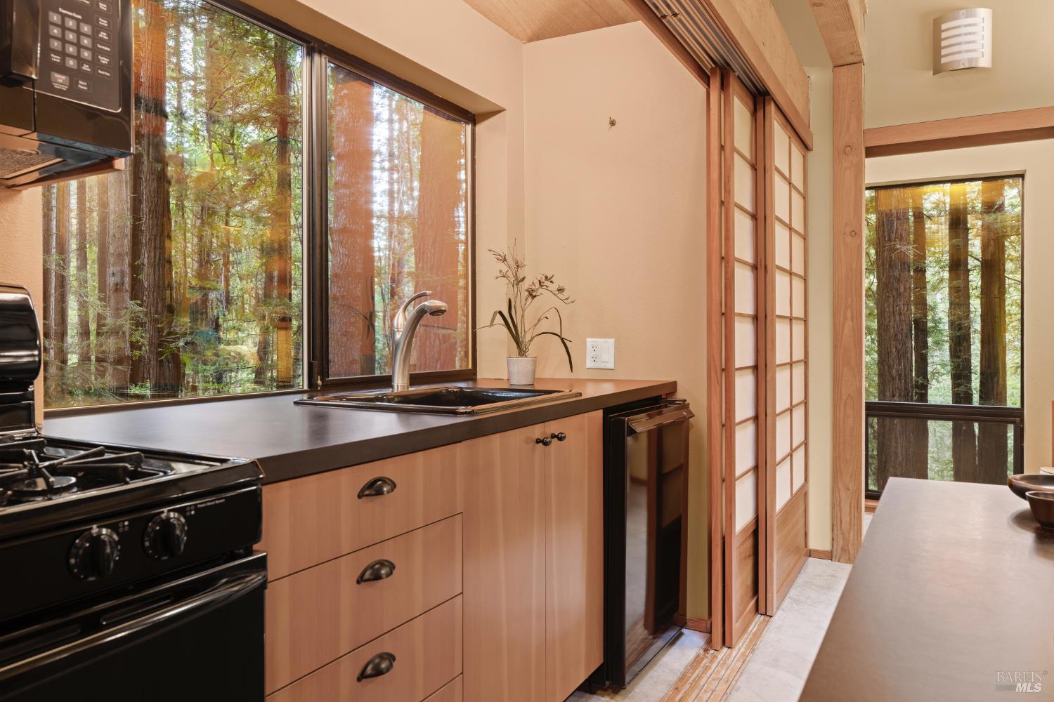 Follow your path through a calming walking experience of the forest before reaching the Tea House. Tea House is a weekend retreat of approximately 384 square foot size with a Japanese aesthetic. Inspired by tea house tradition inside and out, it's an exquisite example of making multiple uses out of a single space by distilling needs down to what really matters. By using alcoves, shoji screens, and a tokonoma it elegantly accommodates living, dining, kitchen, and sleeping all centered on a traditional tatami mat floor. The tiny building appears lifted into place among the redwood trees. Designed by local Architect Fiona E. O'Neill, a one woman-owned firm designing homes at The Sea Ranch since 1991.