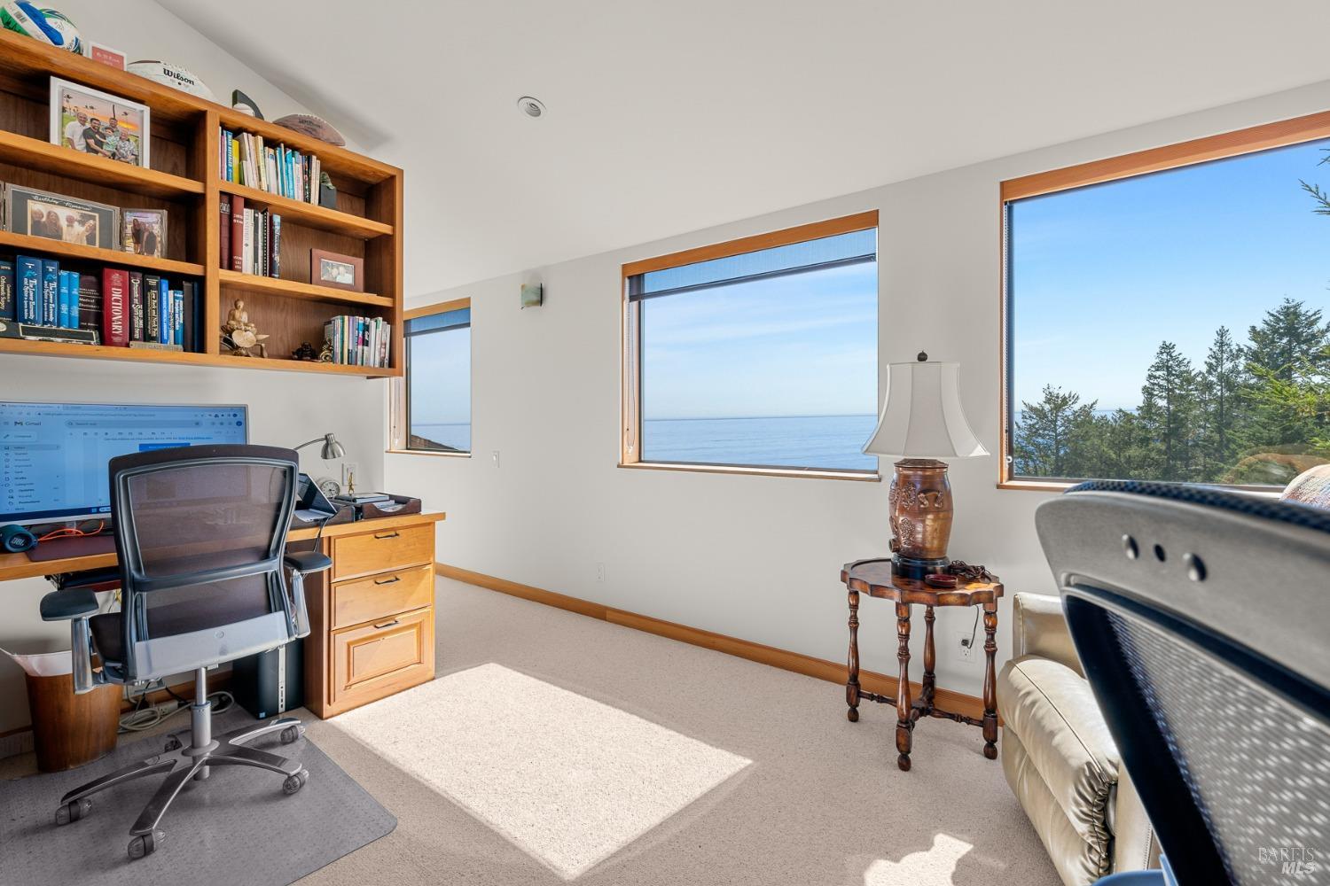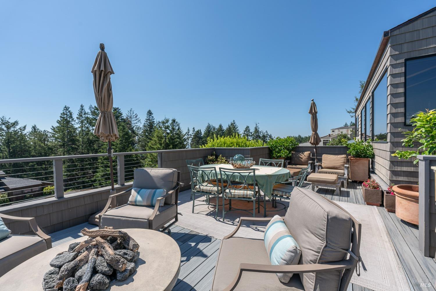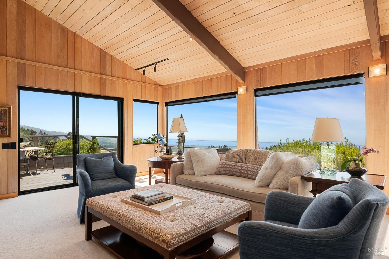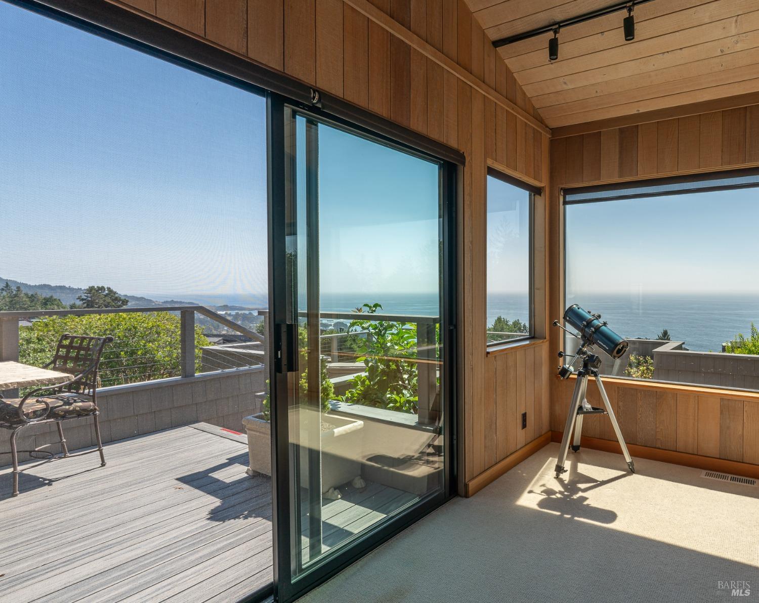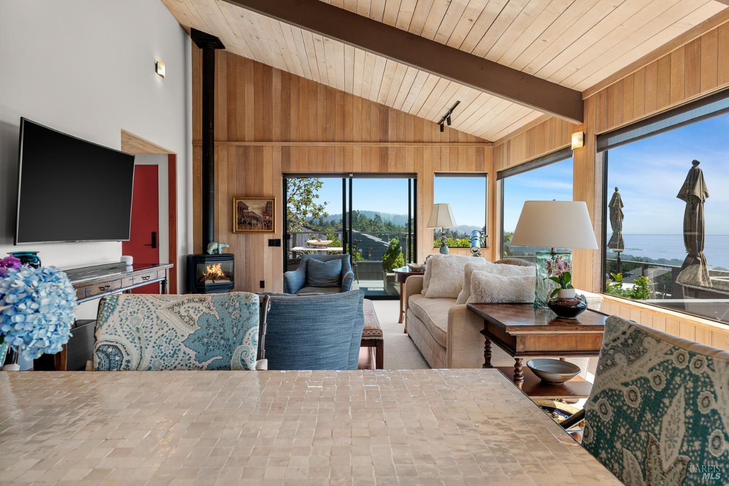 Panoramic coastline ocean views to Black Point welcomes you from this hillside home. Architect Fiona O'Neill masterfully directed a major 2016 remodel and expansion of an older Sea Ranch home and thereby created a modern interpretation of Sea Ranch living. On the main floor you have an ocean view great room with an elegant ocean blue kitchen with marble countertop, stainless steel appliances, induction cooktop and peninsula bar seating. A tiled hallway leads from front door to large laundry and pantry room with barn sliding door; 2 bedrooms suites, beautiful shaded garden area and an amazing view deck in 2 levels. Upstairs is a large office with built-in dual cherry desks, full bath and a loft area. The indoor-outdoor living is magic from the shaded garden, hilltop sunset bench to dining Al Fresco by the propane firepit. The happy potted citrus trees on the deck is a testament to the warm climate at this house. Extra features include attached 2-car garage, solar panels, back-up generator running on propane and fiber optic internet service. The driveway is paved with room for 2-car guest parking. The hillside location on 0.91 acres makes for very private living in the middle of Sea Ranch with hiking trails leading in all compass directions. Large commons on 2-side
