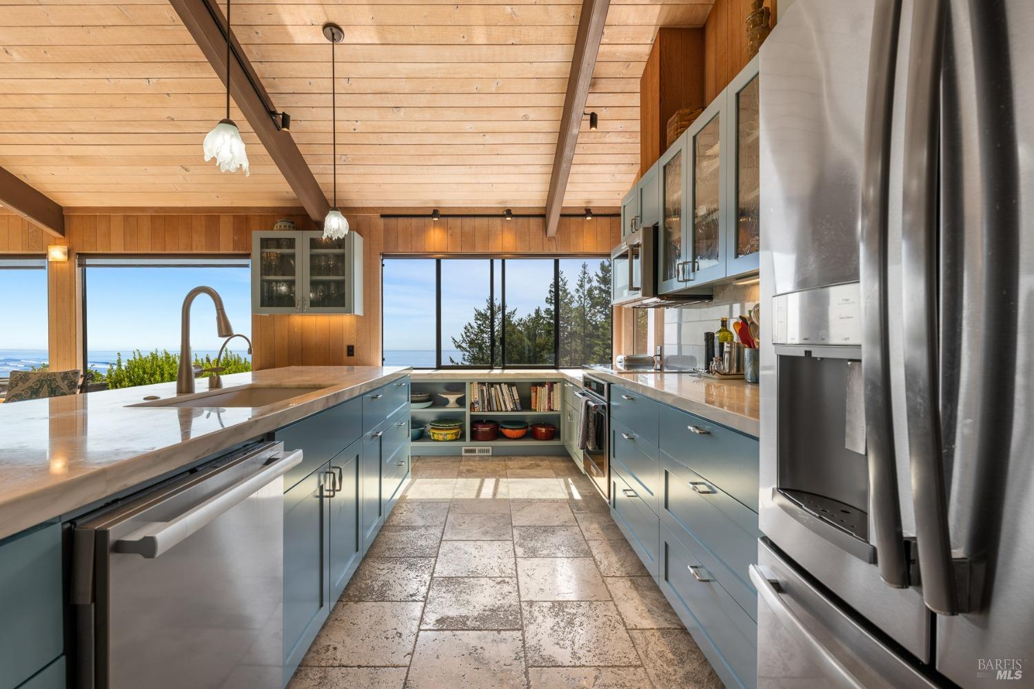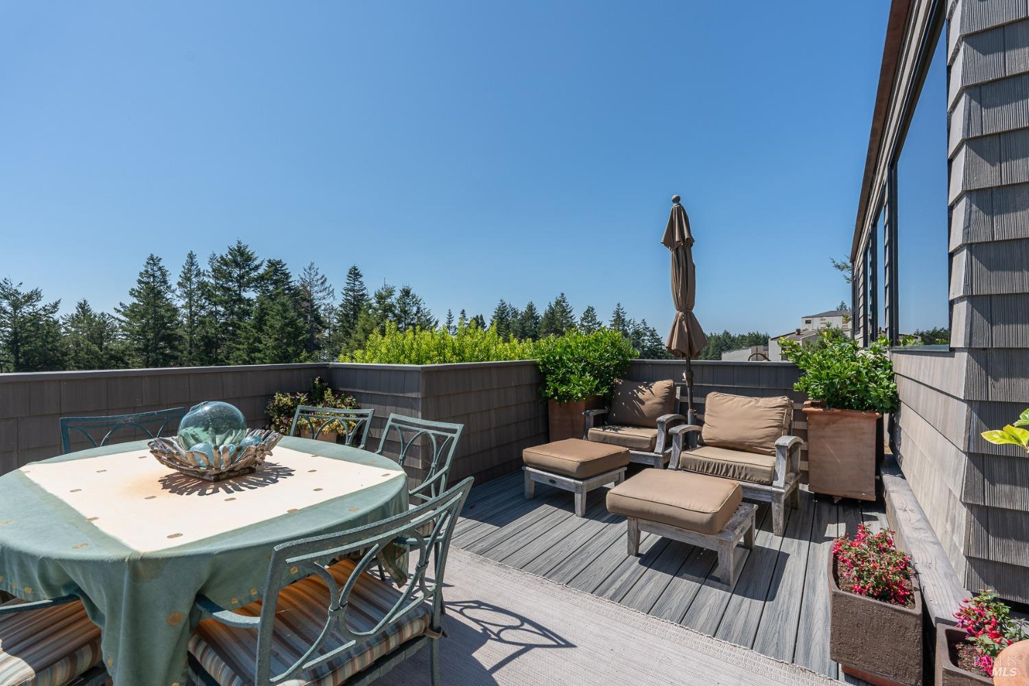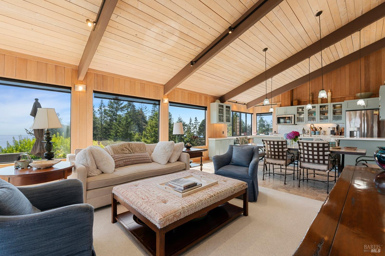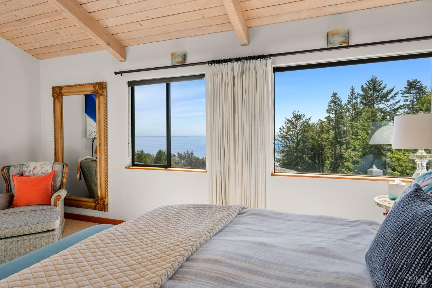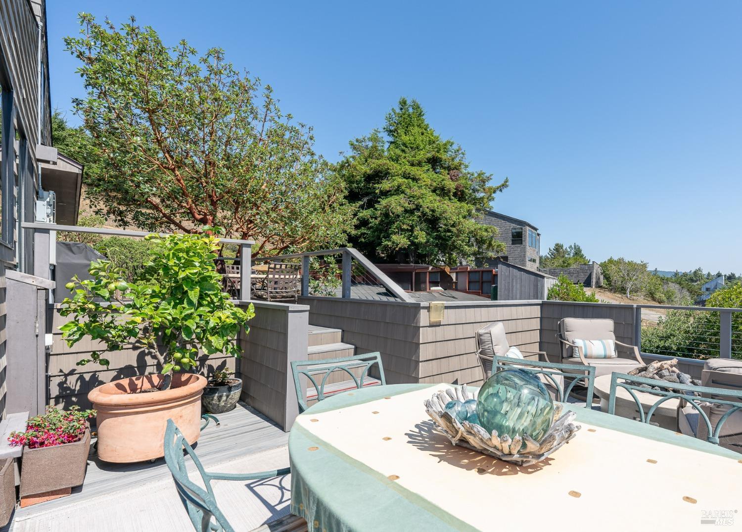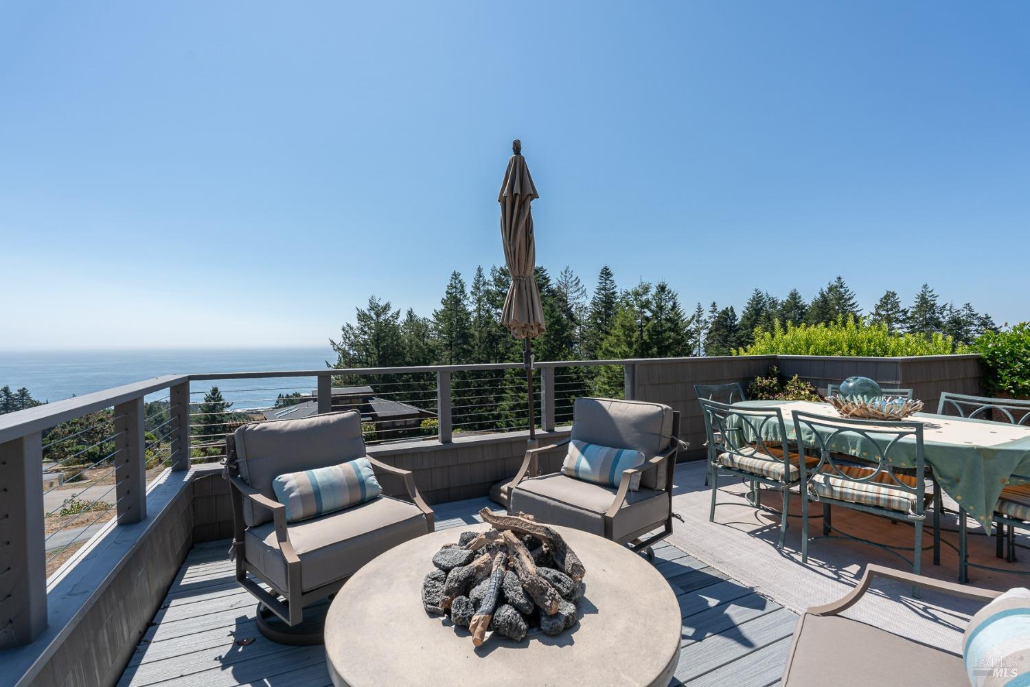Panoramic coastline ocean views to Black Point welcomes you from this hillside home. Architect Fiona O'Neill masterfully directed a major 2016 remodel and expansion of an older Sea Ranch home and thereby created a modern interpretation of Sea Ranch living. On the main floor you have an ocean view great room with an elegant ocean blue kitchen with marble countertop, stainless steel appliances, induction cooktop and peninsula bar seating. A tiled hallway leads from front door to large laundry and pantry room with barn sliding door; 2 bedrooms suites, beautiful shaded garden area and an amazing view deck in 2 levels. Upstairs is a large office with built-in dual cherry desks, full bath and a loft area. The indoor-outdoor living is magic from the shaded garden, hilltop sunset bench to dining Al Fresco by the propane firepit. The happy potted citrus trees on the deck is a testament to the warm climate at this house. Extra features include attached 2-car garage, solar panels, back-up generator running on propane and fiber optic internet service. The driveway is paved with room for 2-car guest parking. The hillside location on 0.91 acres makes for very private living in the middle of Sea Ranch with hiking trails leading in all compass directions. Large commons on 2-side