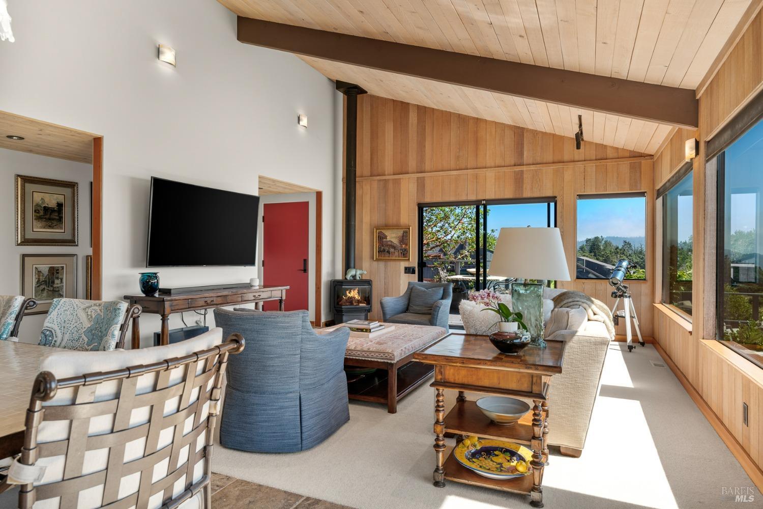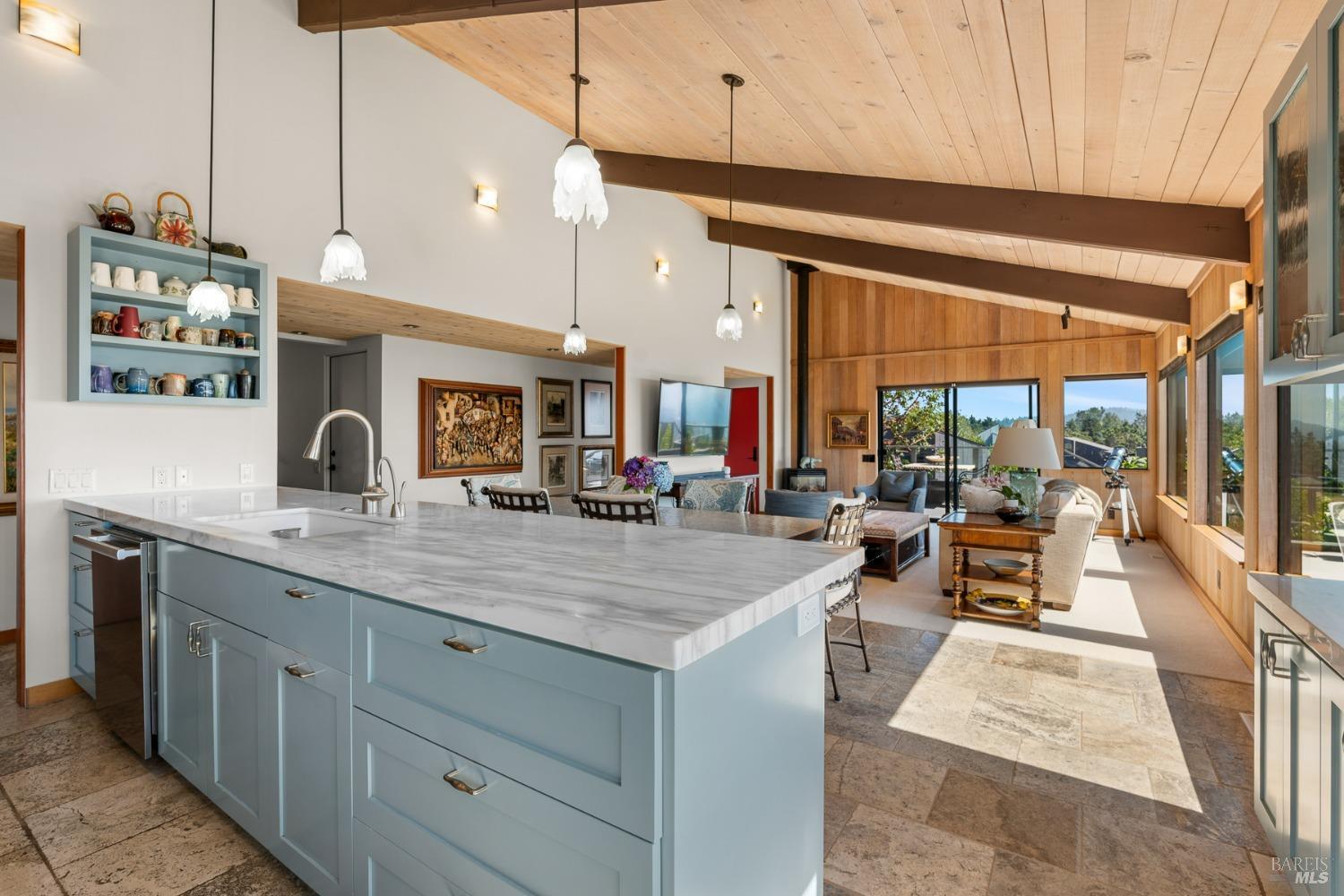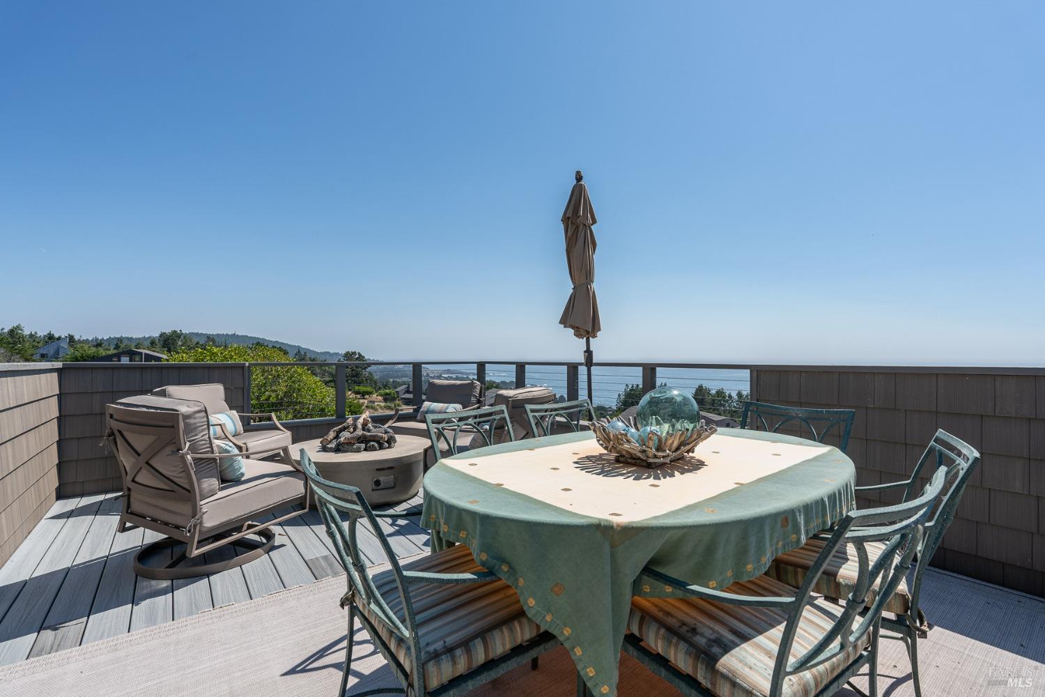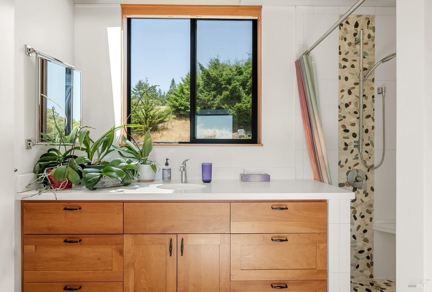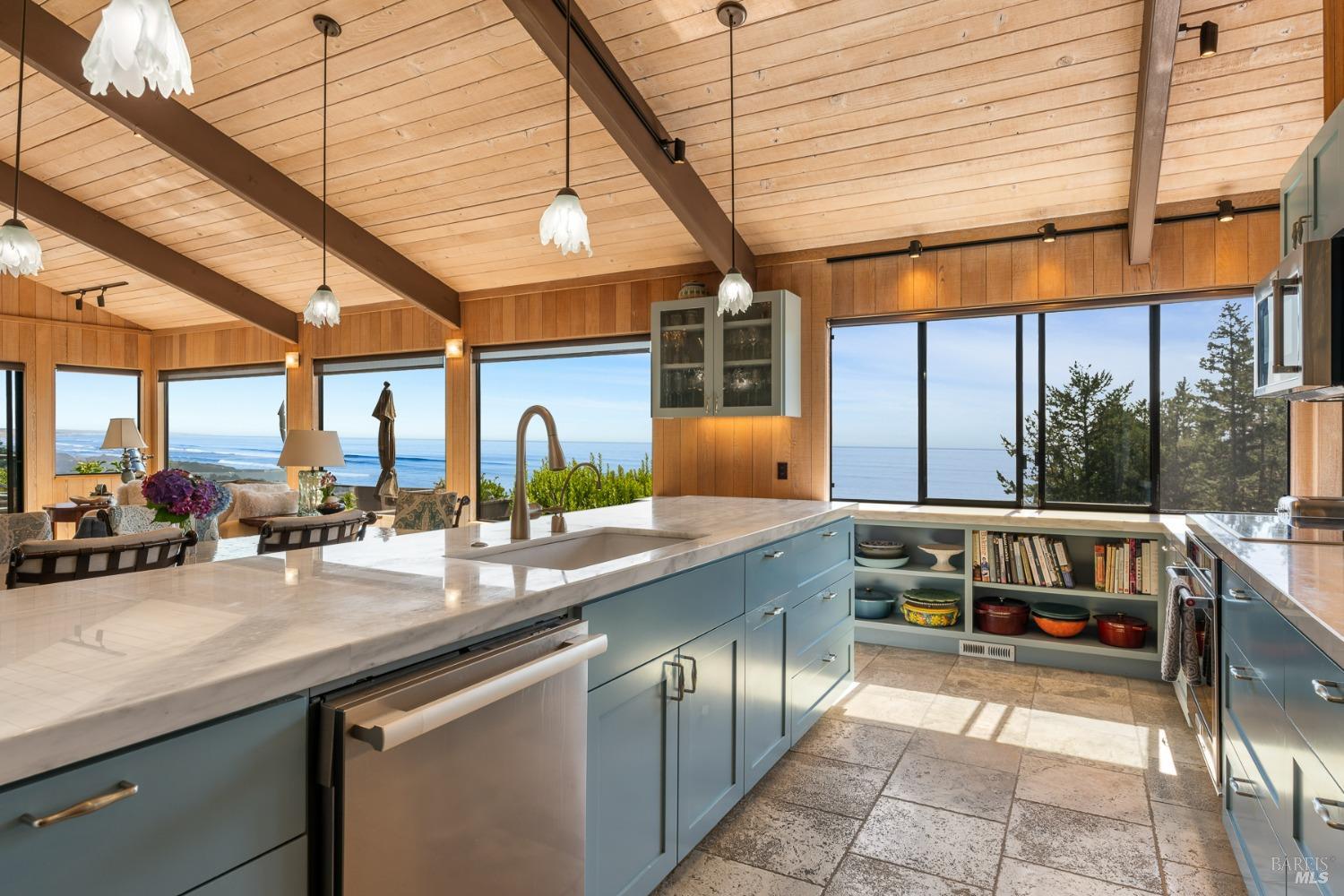 Panoramic coastline ocean views to Black Point welcomes you from this hillside home. Architect Fiona O'Neill masterfully directed a major 2016 remodel and expansion of an older Sea Ranch home and thereby created a modern interpretation of Sea Ranch living. On the main floor you have an ocean view great room with an elegant ocean blue kitchen with marble countertop, stainless steel appliances, induction cooktop and peninsula bar seating. A tiled hallway leads from front door to large laundry and pantry room with barn sliding door; 2 bedrooms suites, beautiful shaded garden area and an amazing view deck in 2 levels. Upstairs is a large office with built-in dual cherry desks, full bath and a loft area. The indoor-outdoor living is magic from the shaded garden, hilltop sunset bench to dining Al Fresco by the propane firepit. The happy potted citrus trees on the deck is a testament to the warm climate at this house. Extra features include attached 2-car garage, solar panels, back-up generator running on propane and fiber optic internet service. The driveway is paved with room for 2-car guest parking. The hillside location on 0.91 acres makes for very private living in the middle of Sea Ranch with hiking trails leading in all compass directions. Large commons on 2-side