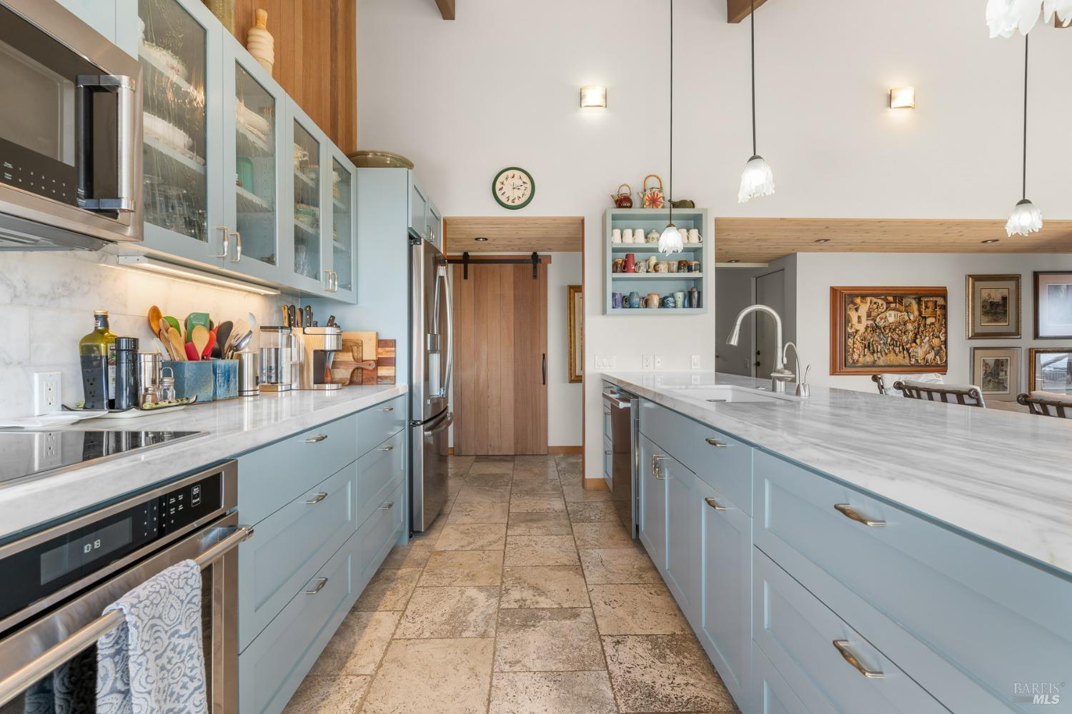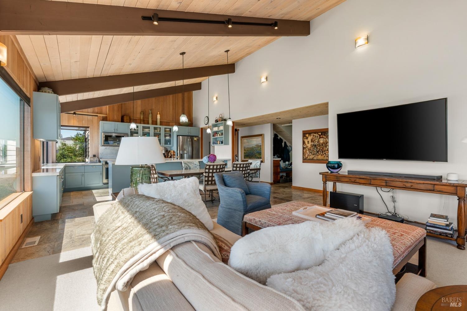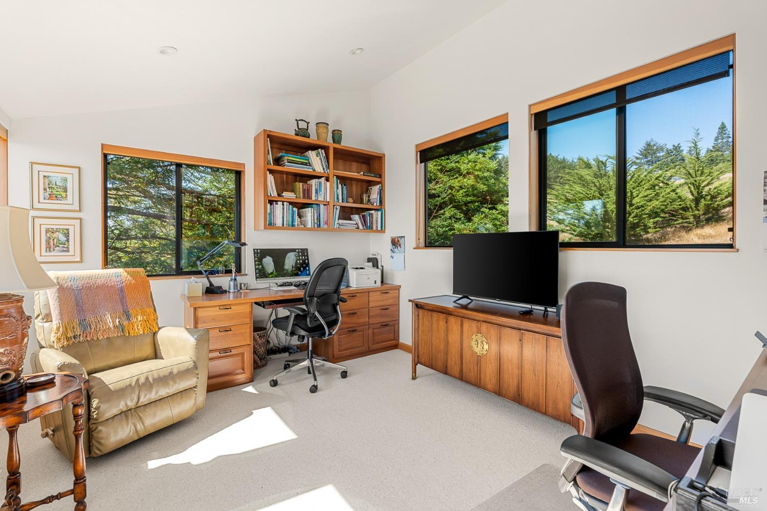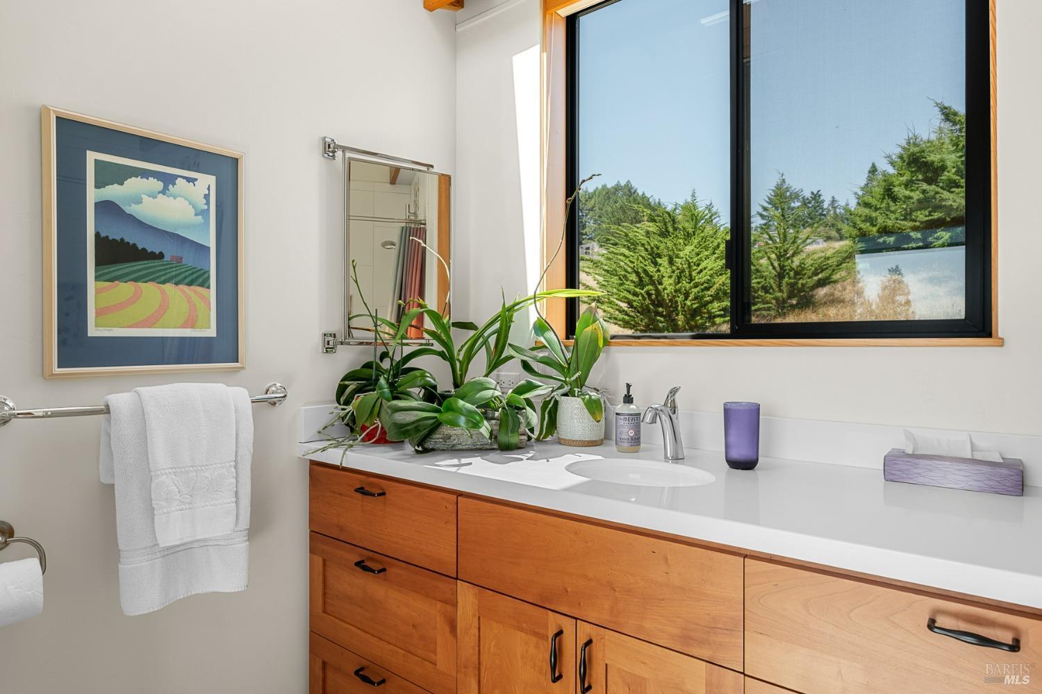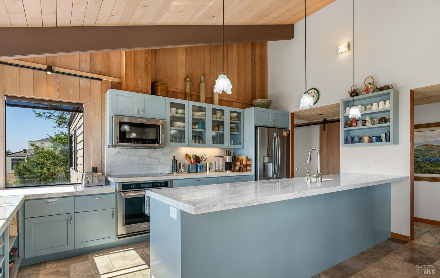 Panoramic coastline ocean views to Black Point welcomes you from this hillside home. Architect Fiona O'Neill masterfully directed a major 2016 remodel and expansion of an older Sea Ranch home and thereby created a modern interpretation of Sea Ranch living. On the main floor you have an ocean view great room with an elegant ocean blue kitchen with marble countertop, stainless steel appliances, induction cooktop and peninsula bar seating. A tiled hallway leads from front door to large laundry and pantry room with barn sliding door; 2 bedrooms suites, beautiful shaded garden area and an amazing view deck in 2 levels. Upstairs is a large office with built-in dual cherry desks, full bath and a loft area. The indoor-outdoor living is magic from the shaded garden, hilltop sunset bench to dining Al Fresco by the propane firepit. The happy potted citrus trees on the deck is a testament to the warm climate at this house. Extra features include attached 2-car garage, solar panels, back-up generator running on propane and fiber optic internet service. The driveway is paved with room for 2-car guest parking. The hillside location on 0.91 acres makes for very private living in the middle of Sea Ranch with hiking trails leading in all compass directions. Large commons on 2-side