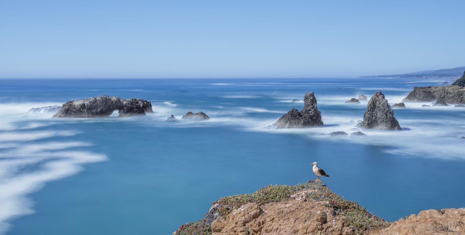 Welcome to this thoughtfully designed 3 bed/3 bath one-level sanctuary with beautiful ocean views just steps from the bluff. The lovely home is sold by the original owners who took excellent care of it. You enter through the wind protected private courtyard with a separate entrance to a bedroom suite and to the large, detached two car garage with extra storage room. These extensions were added in 1999. Enjoy sweeping water views over the vast meadow from the living room, sunroom and ocean facing deck. The owners love to watch wildlife outside their windows, where spring fawns play, hawks circle above and you see whales breaching in the distance. You can sit next to the cozy fireplace and watch dramatic storms come and go, breathtaking sunsets and starry nights. The ever-changing view of nature, ocean and sky is fascinating and the only traffic you'll see is the occasional big ship or small boat passing by. The modern kitchen with granite countertops and lots of storage space has an efficient layout and the bar counter overlooks the dining area which makes entertaining easy. The adjacent laundry room separates this part of the house from the added private ocean view bedroom suite with the separate entrance. Next to the living room is the primary bedroom suite with deck access and there is a 3rd bedroom down the hallway with another bathroom. This desirable location is close to the Golf Course and the town of Gualala for amenities and shopping. It is served by sewer and underground utilities including fiberoptic internet. The Del Mar Recreation Center is minutes away with heated pool, sauna, tennis and gardens. You have access to 50+ miles of private trails along spectacular beaches and into the magnificent redwood forest. Whether you enjoy the sunset from your deck or hike the trails, you will be captivated by the peace and quiet of this magical place.