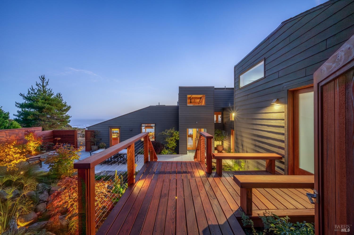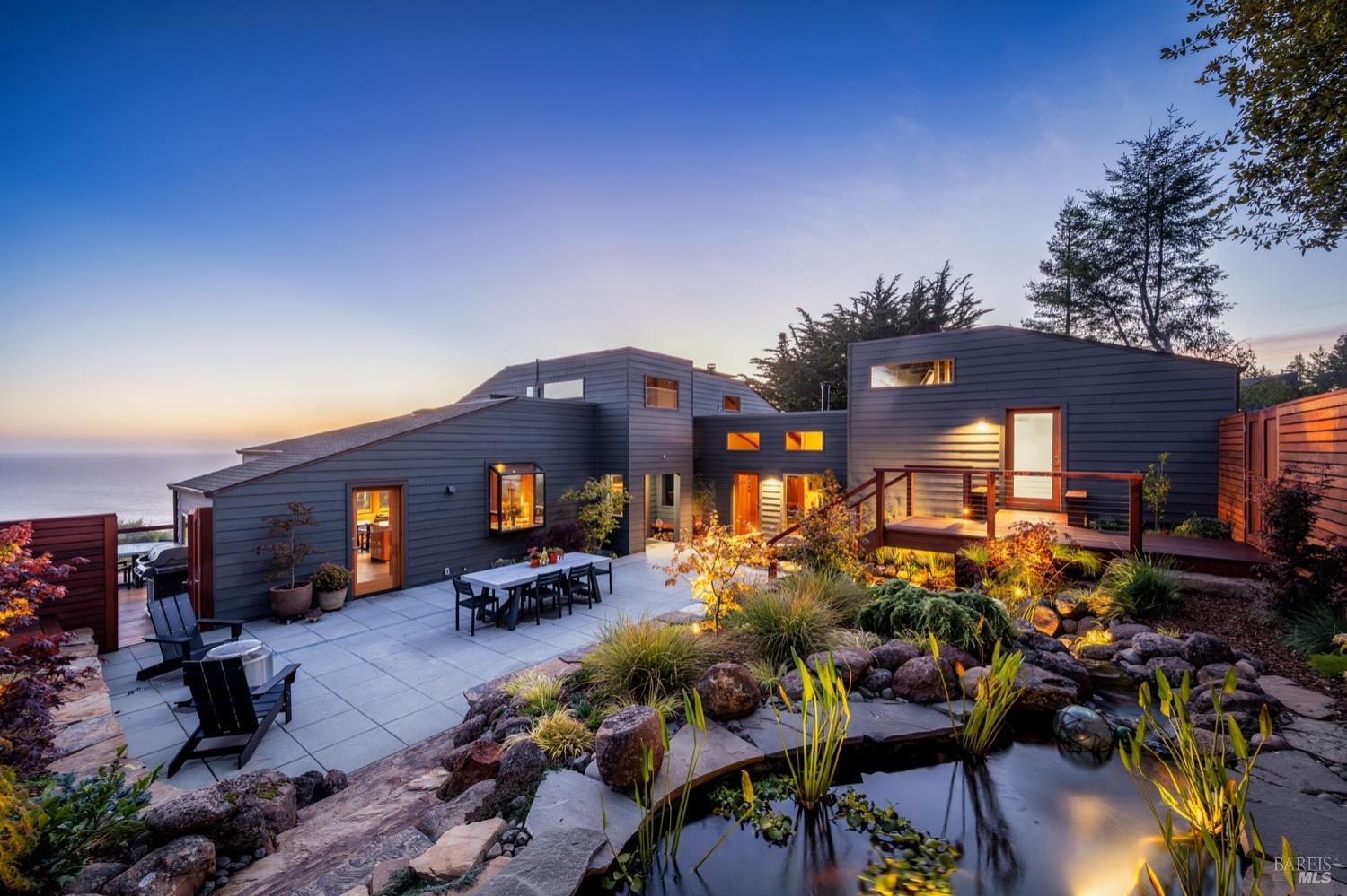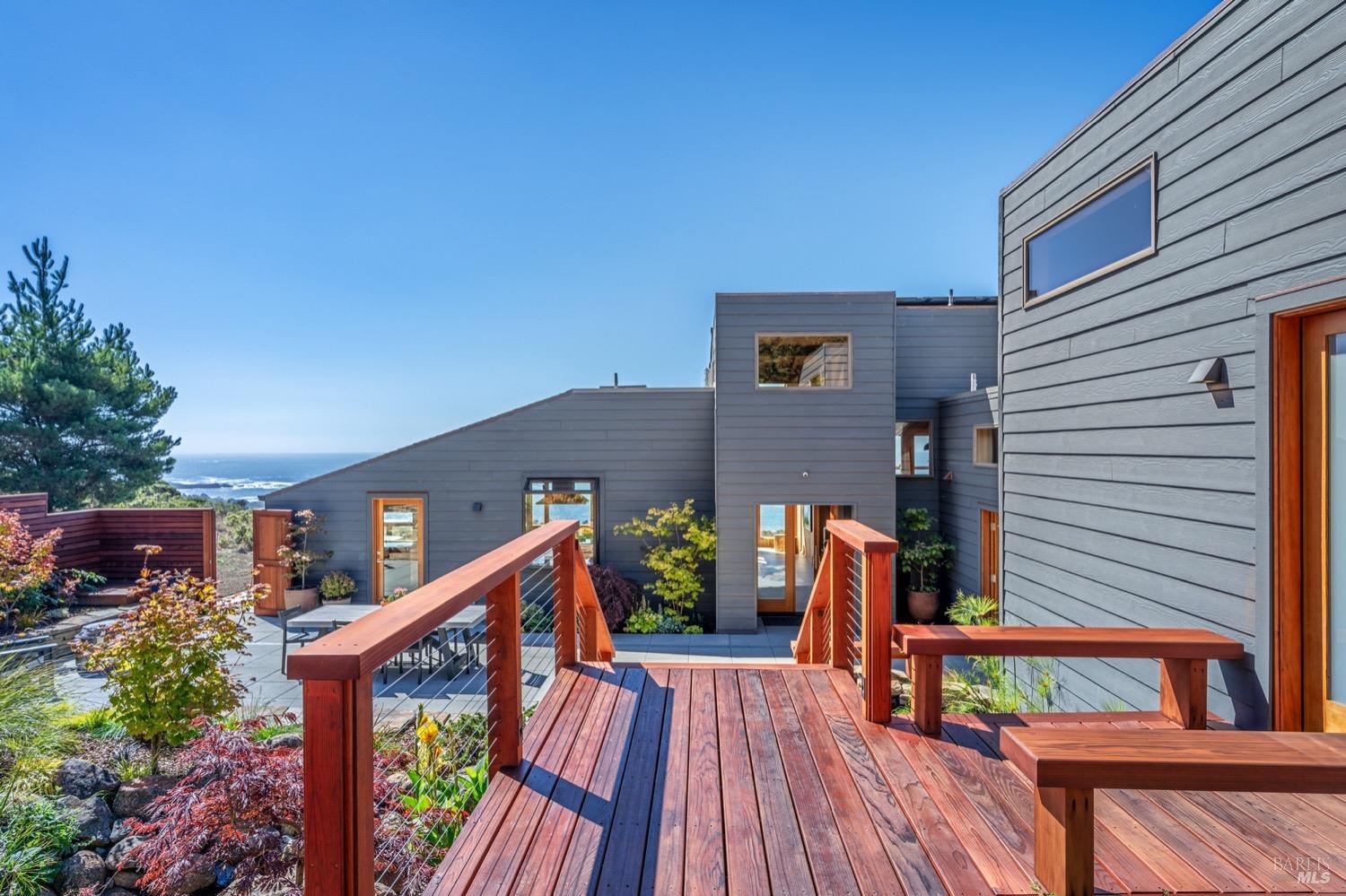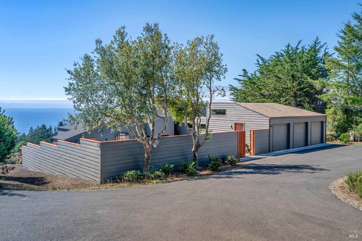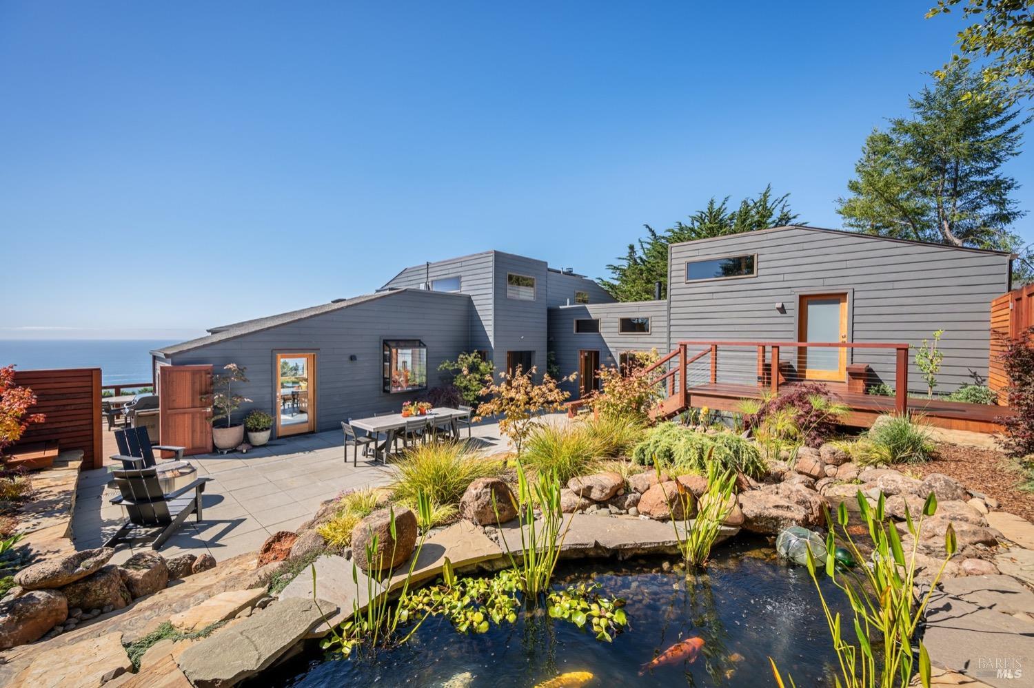 In 2023 this wonderful home was extensively remodeled and updated, using the finest materials and craftsmanship. One of the first Real Estate Brokers at The Sea Ranch who had his pick of building sites, chose 440 Drovers Close. This piece of Sea Ranch history, includes a 1.39-acre lot with breathtaking panoramic white and blue views including Black Point Beach to the South. Waves can be heard over the more than nine acres of Sea Ranch commons that add to the property's unmatched privacy. Legendary builder Ralph Jackson completed the renovation creating the classic Sea Ranch style and craftsmanship including many beautiful vertical grain fir walls. New kitchens and three new bathrooms with the highest quality appliances and fixtures make the inside of this home and its separate guest house as spectacular as the outside views. The main house features a large living room, dining room and kitchen that is ideal for sharing with friends and family, while being cozy enough for one or two. Unique to this property is a 3-car garage and a beautiful entry courtyard with Koi ponds, a custom walkway and stairs leading to an expansive wind-protected patio just outside the front door, and solar panels with the transferable higher rate structure that covers the home's electrical costs.