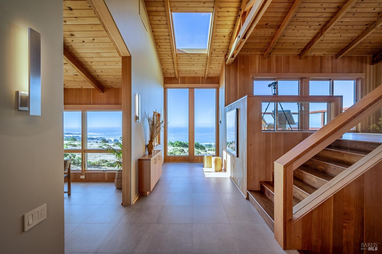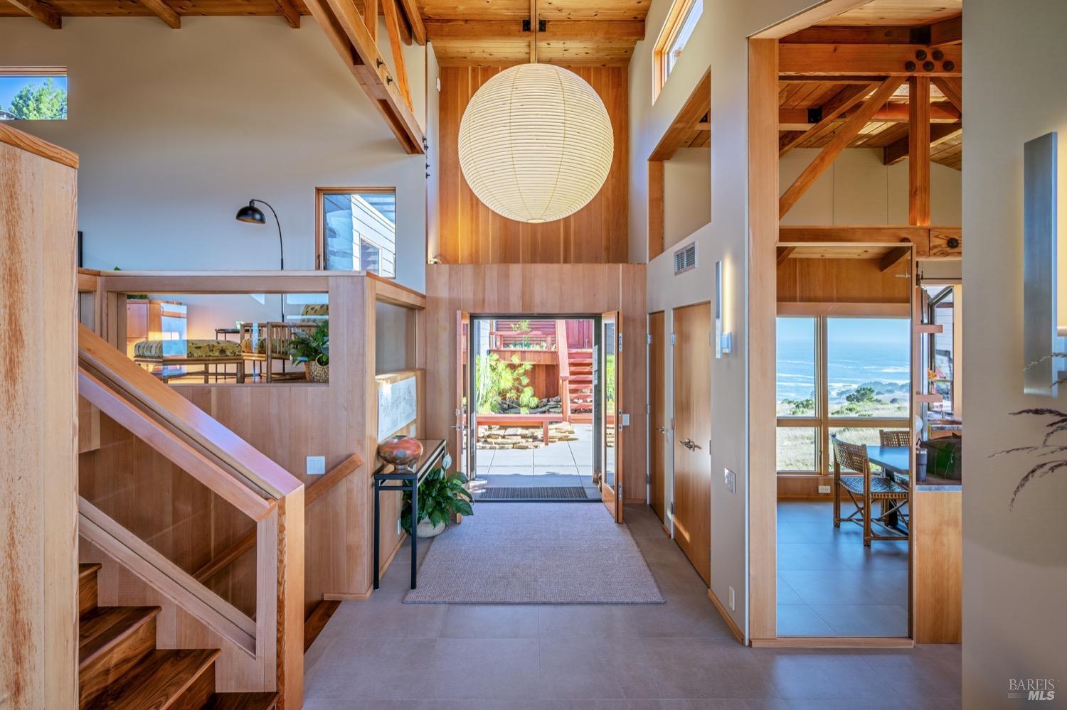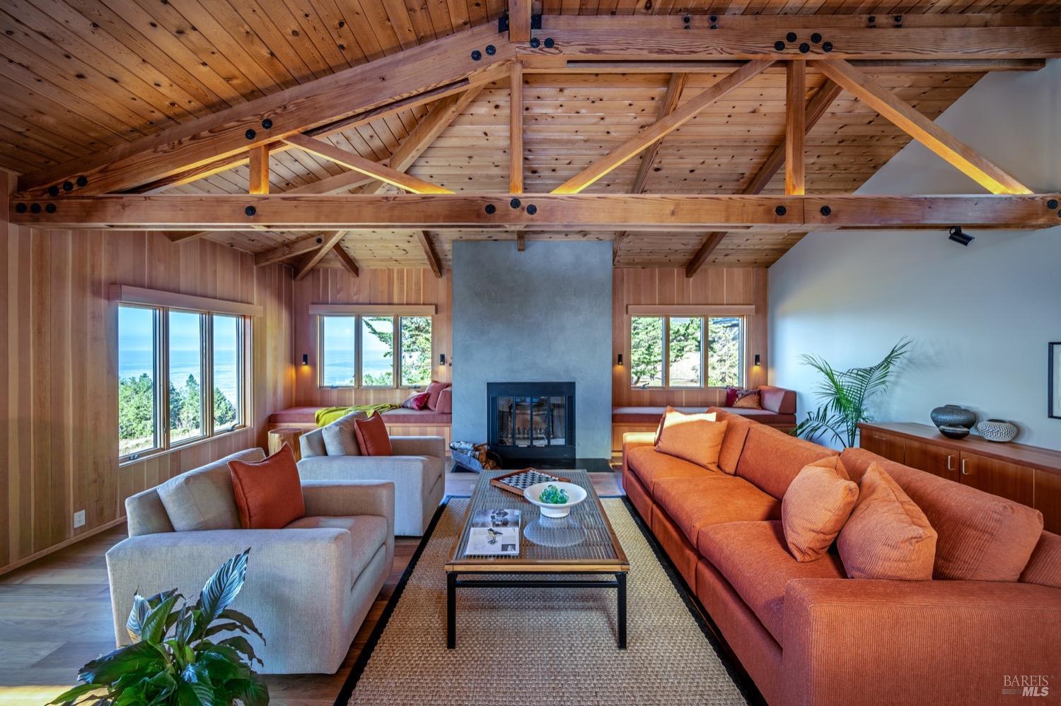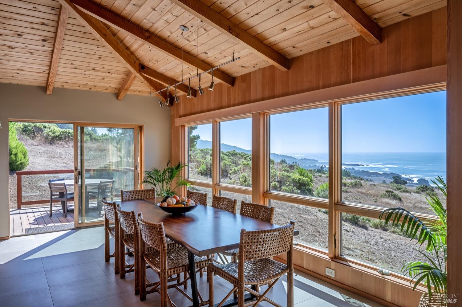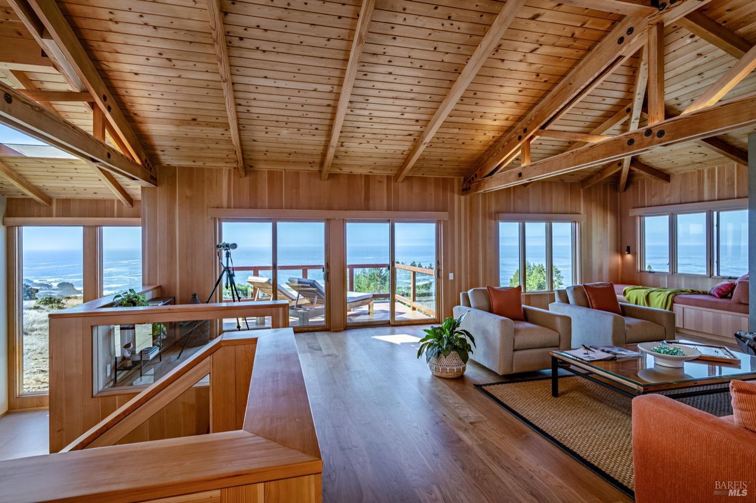 In 2023 this wonderful home was extensively remodeled and updated, using the finest materials and craftsmanship. One of the first Real Estate Brokers at The Sea Ranch who had his pick of building sites, chose 440 Drovers Close. This piece of Sea Ranch history, includes a 1.39-acre lot with breathtaking panoramic white and blue views including Black Point Beach to the South. Waves can be heard over the more than nine acres of Sea Ranch commons that add to the property's unmatched privacy. Legendary builder Ralph Jackson completed the renovation creating the classic Sea Ranch style and craftsmanship including many beautiful vertical grain fir walls. New kitchens and three new bathrooms with the highest quality appliances and fixtures make the inside of this home and its separate guest house as spectacular as the outside views. The main house features a large living room, dining room and kitchen that is ideal for sharing with friends and family, while being cozy enough for one or two. Unique to this property is a 3-car garage and a beautiful entry courtyard with Koi ponds, a custom walkway and stairs leading to an expansive wind-protected patio just outside the front door, and solar panels with the transferable higher rate structure that covers the home's electrical costs.