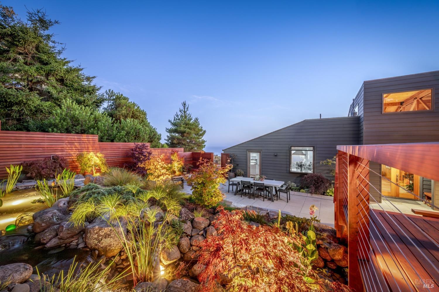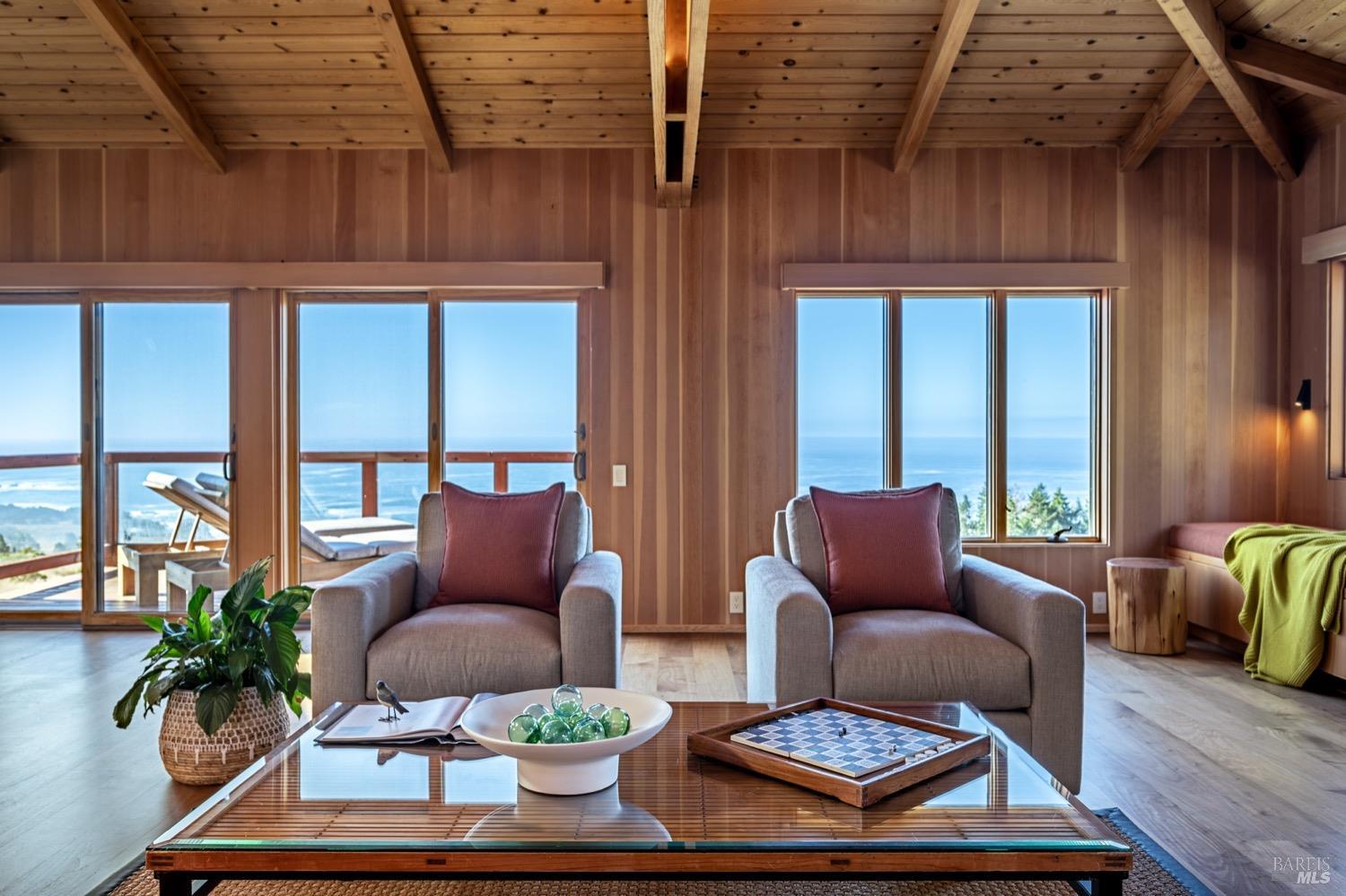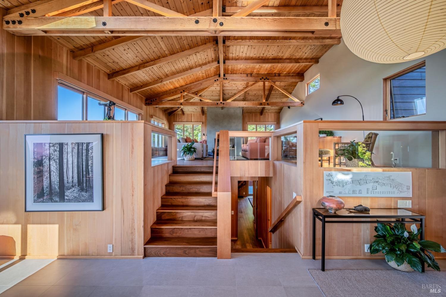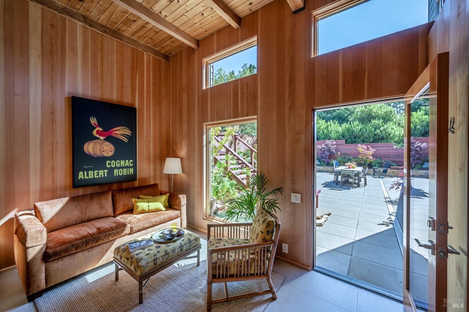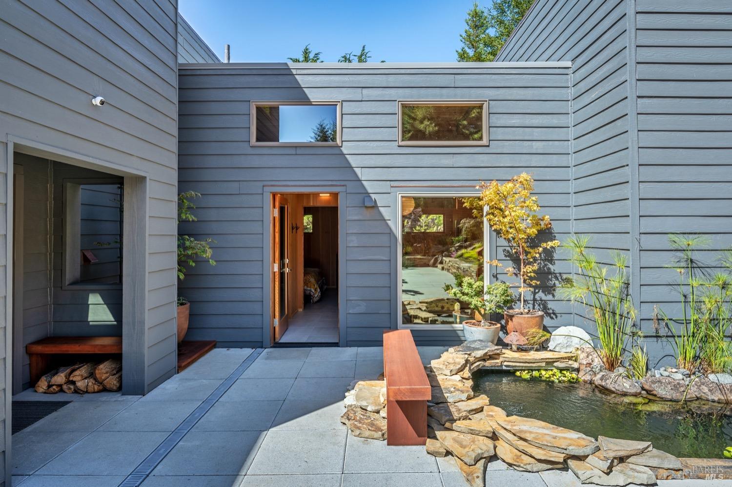 In 2023 this wonderful home was extensively remodeled and updated, using the finest materials and craftsmanship. One of the first Real Estate Brokers at The Sea Ranch who had his pick of building sites, chose 440 Drovers Close. This piece of Sea Ranch history, includes a 1.39-acre lot with breathtaking panoramic white and blue views including Black Point Beach to the South. Waves can be heard over the more than nine acres of Sea Ranch commons that add to the property's unmatched privacy. Legendary builder Ralph Jackson completed the renovation creating the classic Sea Ranch style and craftsmanship including many beautiful vertical grain fir walls. New kitchens and three new bathrooms with the highest quality appliances and fixtures make the inside of this home and its separate guest house as spectacular as the outside views. The main house features a large living room, dining room and kitchen that is ideal for sharing with friends and family, while being cozy enough for one or two. Unique to this property is a 3-car garage and a beautiful entry courtyard with Koi ponds, a custom walkway and stairs leading to an expansive wind-protected patio just outside the front door, and solar panels with the transferable higher rate structure that covers the home's electrical costs.