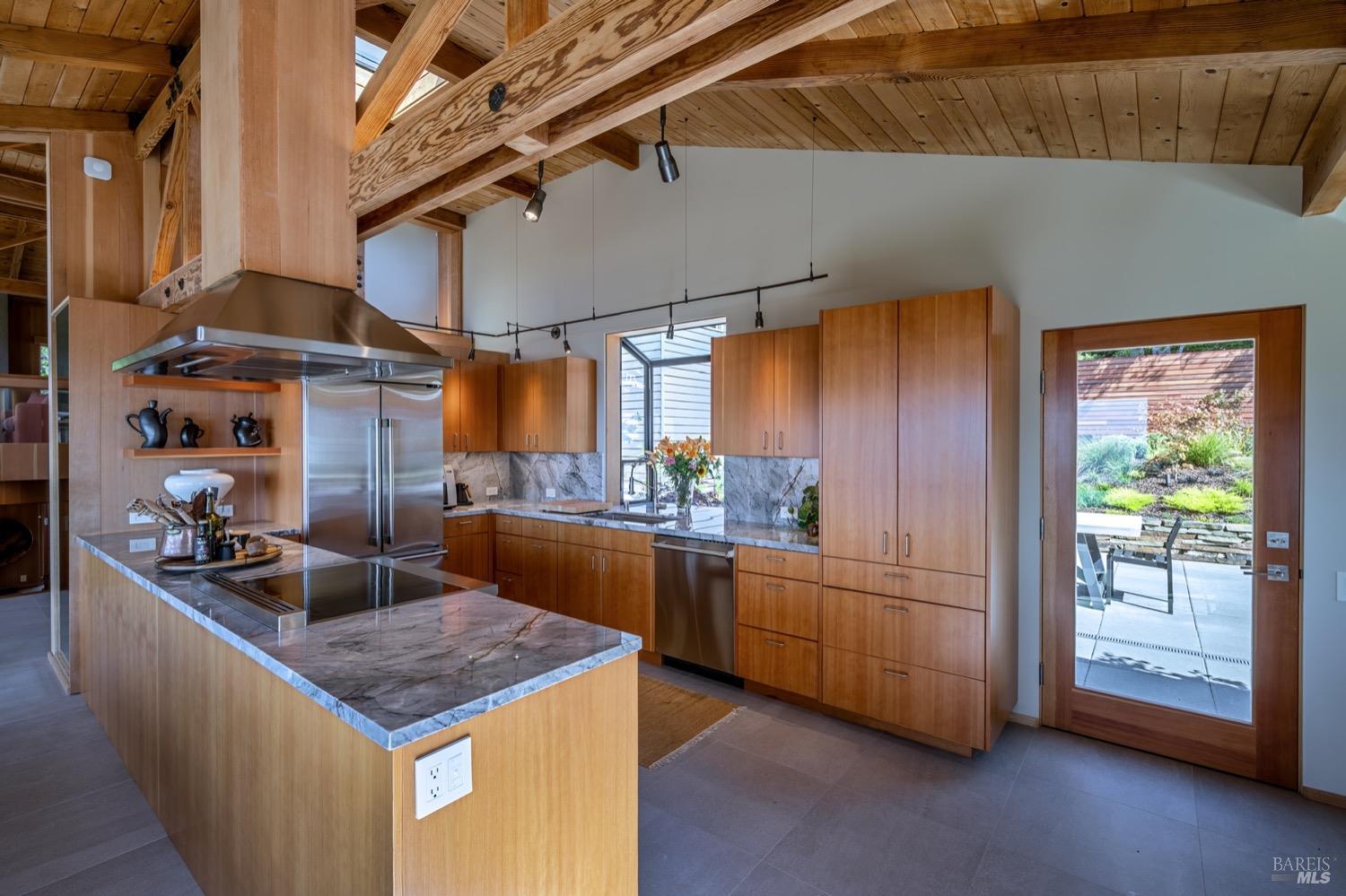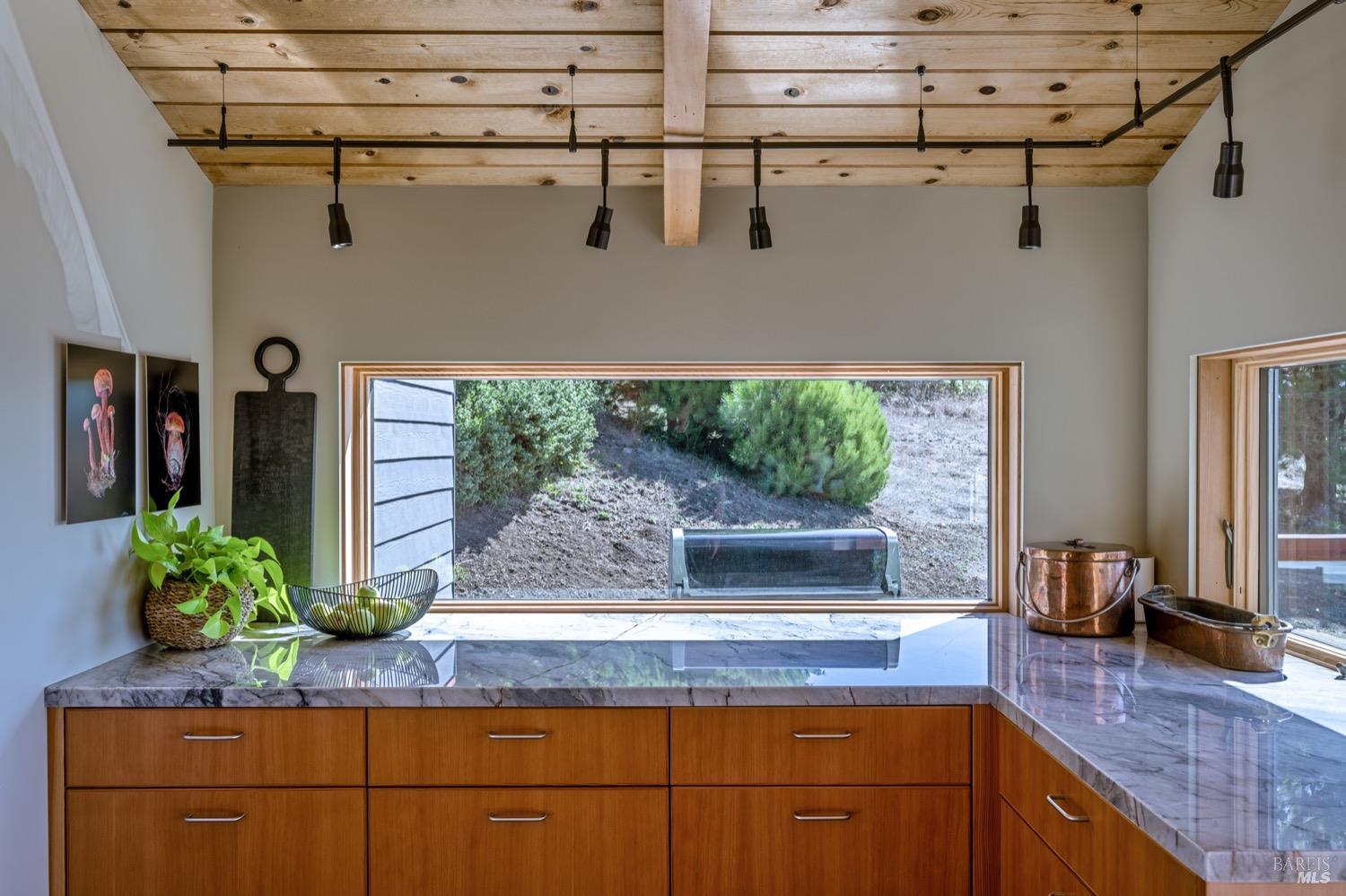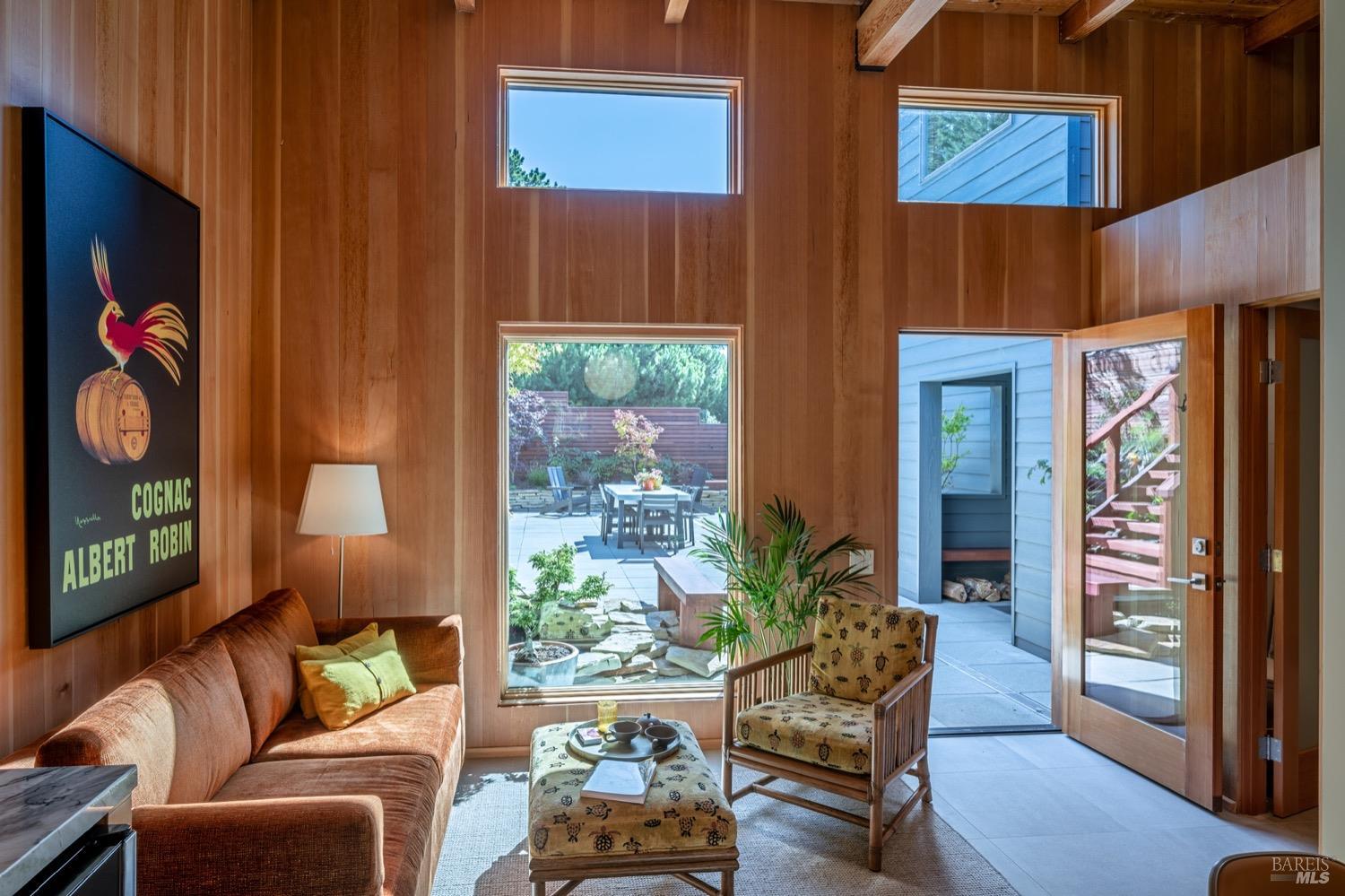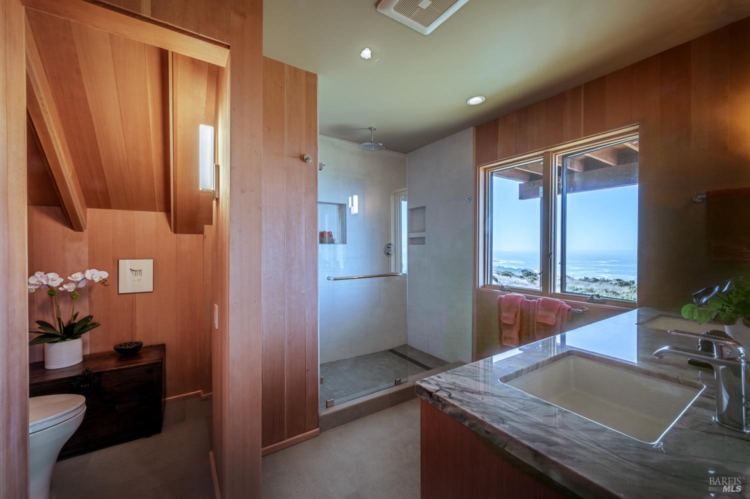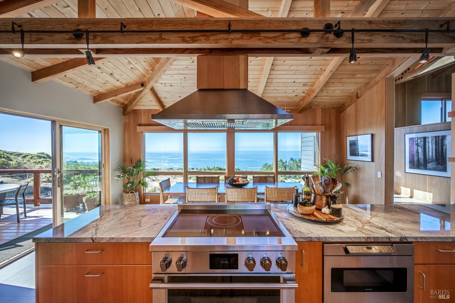 In 2023 this wonderful home was extensively remodeled and updated, using the finest materials and craftsmanship. One of the first Real Estate Brokers at The Sea Ranch who had his pick of building sites, chose 440 Drovers Close. This piece of Sea Ranch history, includes a 1.39-acre lot with breathtaking panoramic white and blue views including Black Point Beach to the South. Waves can be heard over the more than nine acres of Sea Ranch commons that add to the property's unmatched privacy. Legendary builder Ralph Jackson completed the renovation creating the classic Sea Ranch style and craftsmanship including many beautiful vertical grain fir walls. New kitchens and three new bathrooms with the highest quality appliances and fixtures make the inside of this home and its separate guest house as spectacular as the outside views. The main house features a large living room, dining room and kitchen that is ideal for sharing with friends and family, while being cozy enough for one or two. Unique to this property is a 3-car garage and a beautiful entry courtyard with Koi ponds, a custom walkway and stairs leading to an expansive wind-protected patio just outside the front door, and solar panels with the transferable higher rate structure that covers the home's electrical costs.