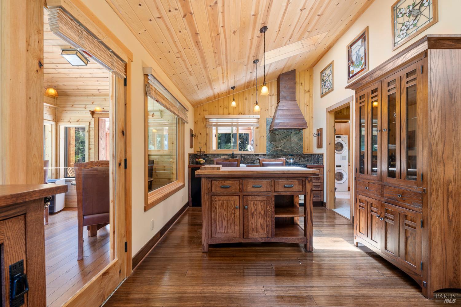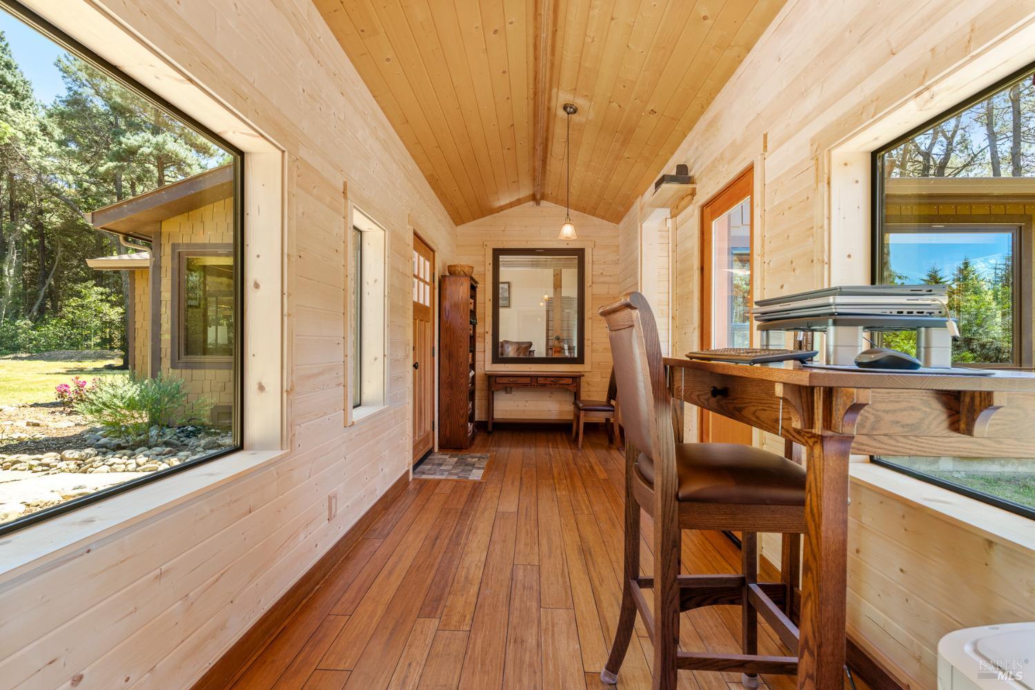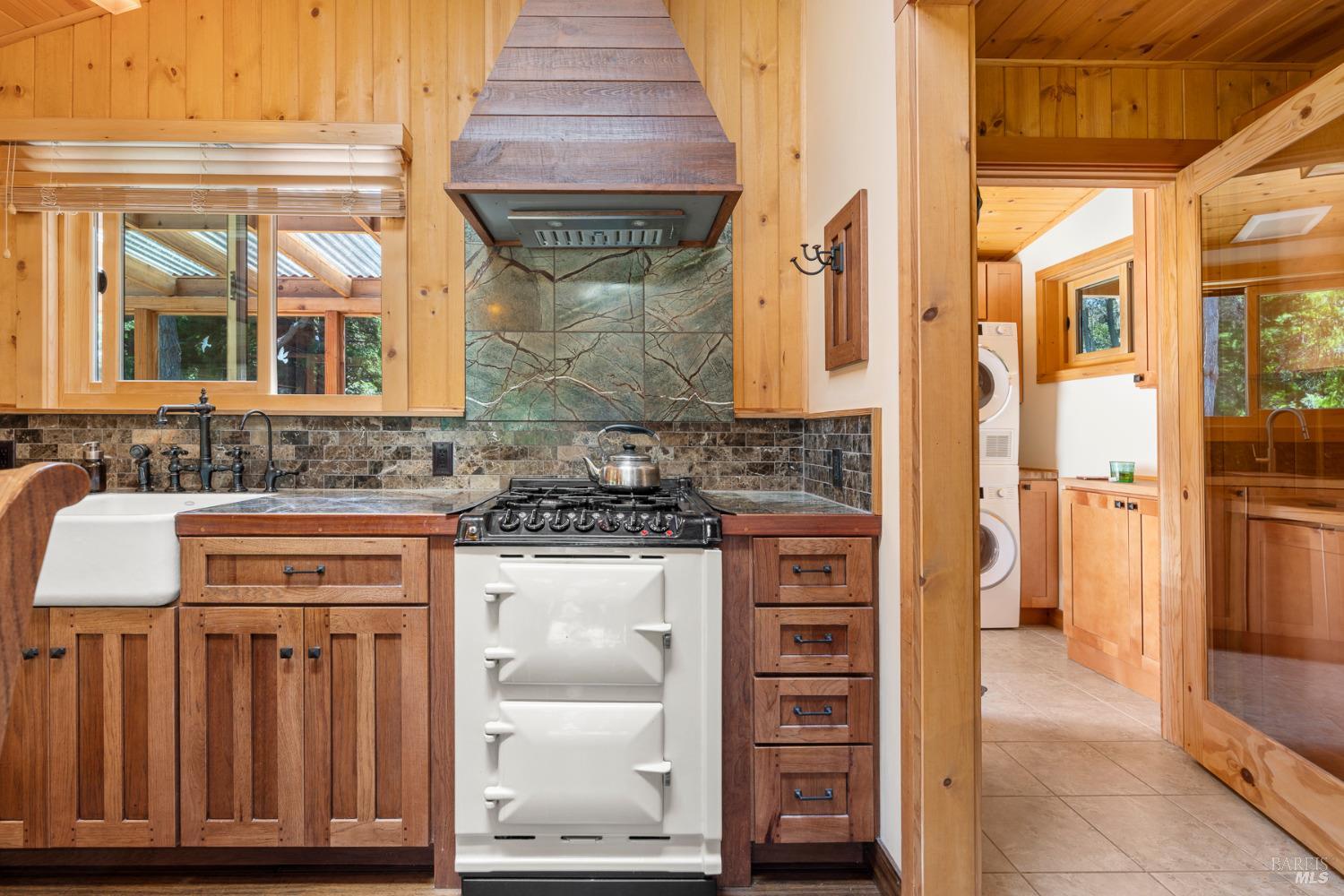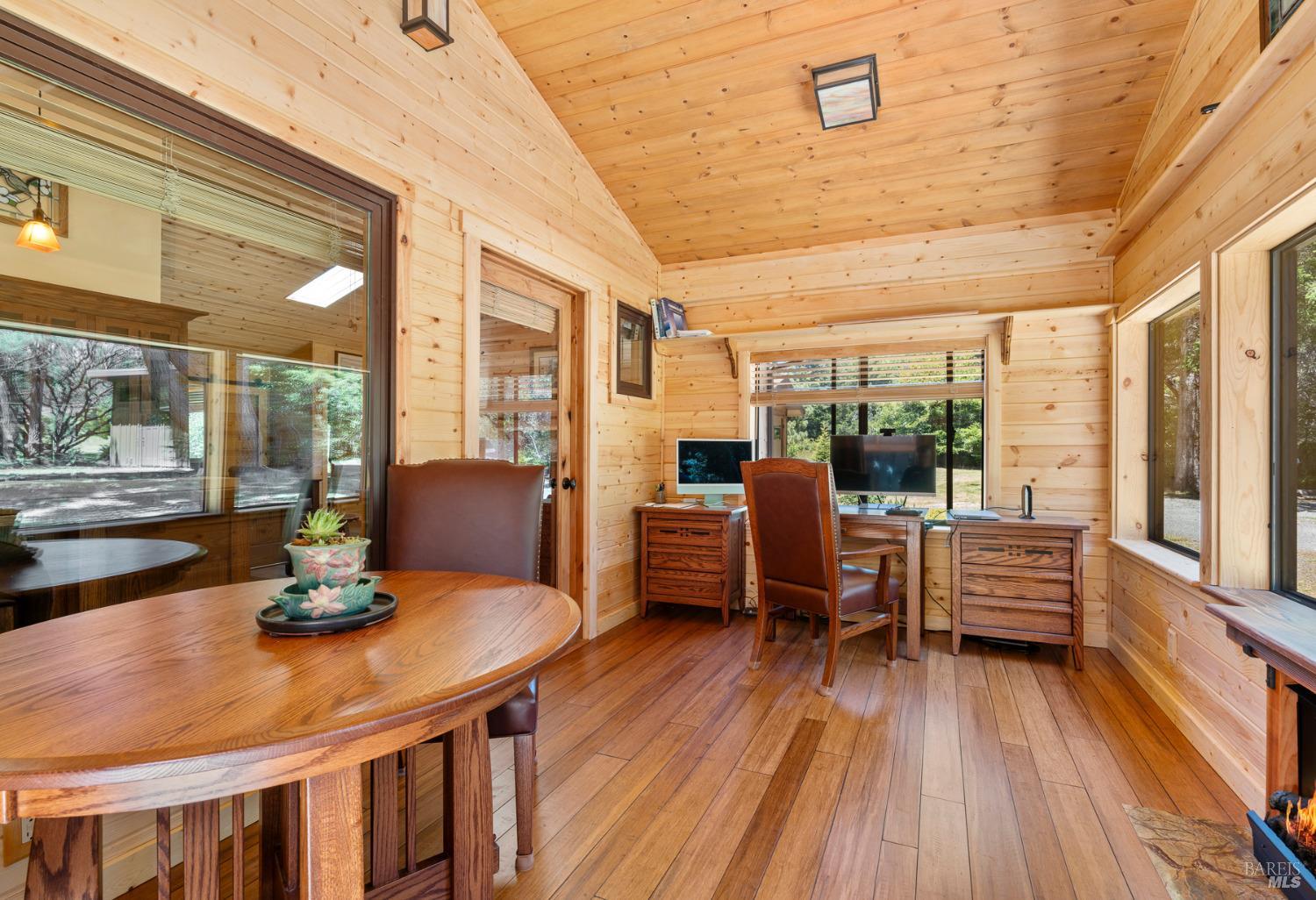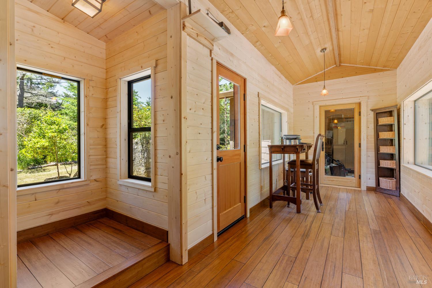 A magical 2 bedroom/1 bath completely rebuilt home located on 2.7 acres with deeded access to private Island Cove. Custom Christopher Ott design hosts Elevated Ceilings with tongue and groove (pine/cedar), Hickory Solid Wood cabinets, Kohler sinks and fixtures, Marble countertops and fireplace; Travertine, Solid Bamboo and Tile flooring; Custom Redwood Greenhouse with Onyx Tile entrance; Sunroom with expansive meadow view surrounded by acres of redwood groves, rhododendrons, dogwoods, Ferns, and a natural spring. Yoga/Sauna studio with Scandia propane 40,000 BTU heater and Vermont Castings Stardance and Hearthstone Propane Stoves along with a 10x12 studio/office. New Redwood deck connected to primary bedroom. An Aga Stove (dual fuel) from England in conjunction with Custom Cherry Butcher Block Amish handmade oak kitchen island and a Butler's pantry with maple butcher block countertop complete an optimal cooking experience. Bosch, Miele and Summit appliances AND an insulated separate studio ready for multiple use. Generac Propane generator, 50 AMP EV prewired, and 30 AMP RV charging hook with water along with a 2019 30-year roof and seamless gutters provide seamless living at its finest. Attached you will find a list of features that define this treasured special home.