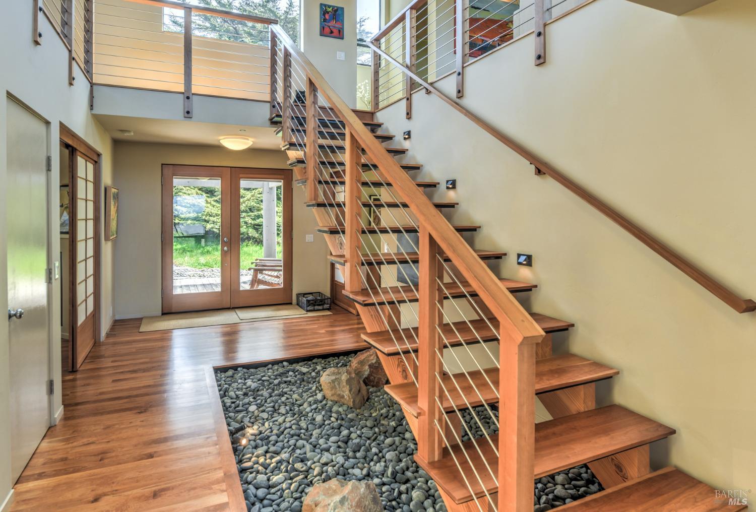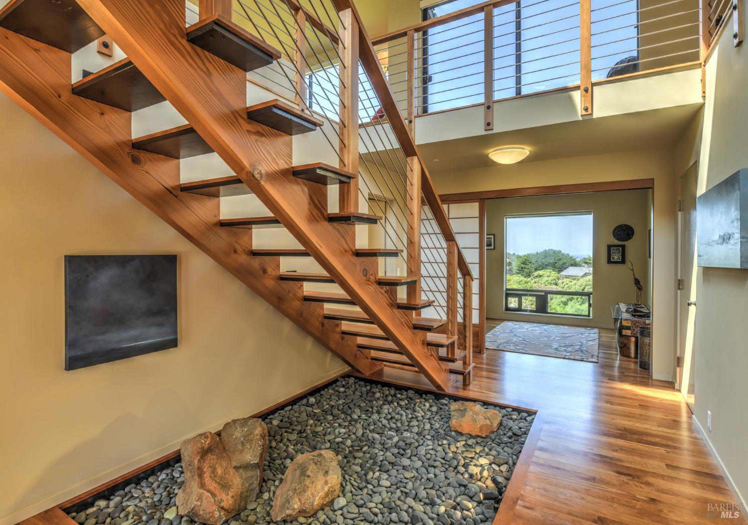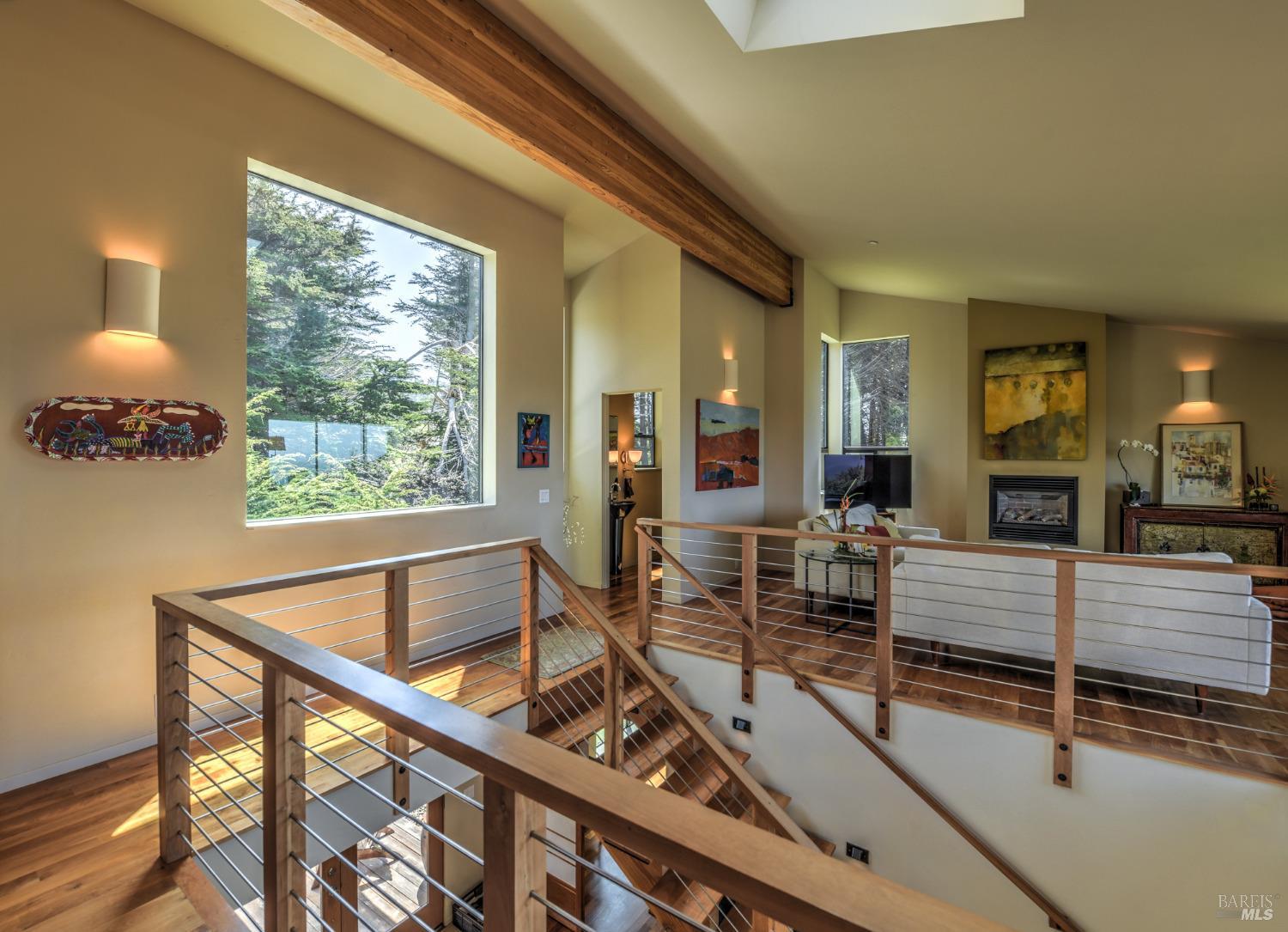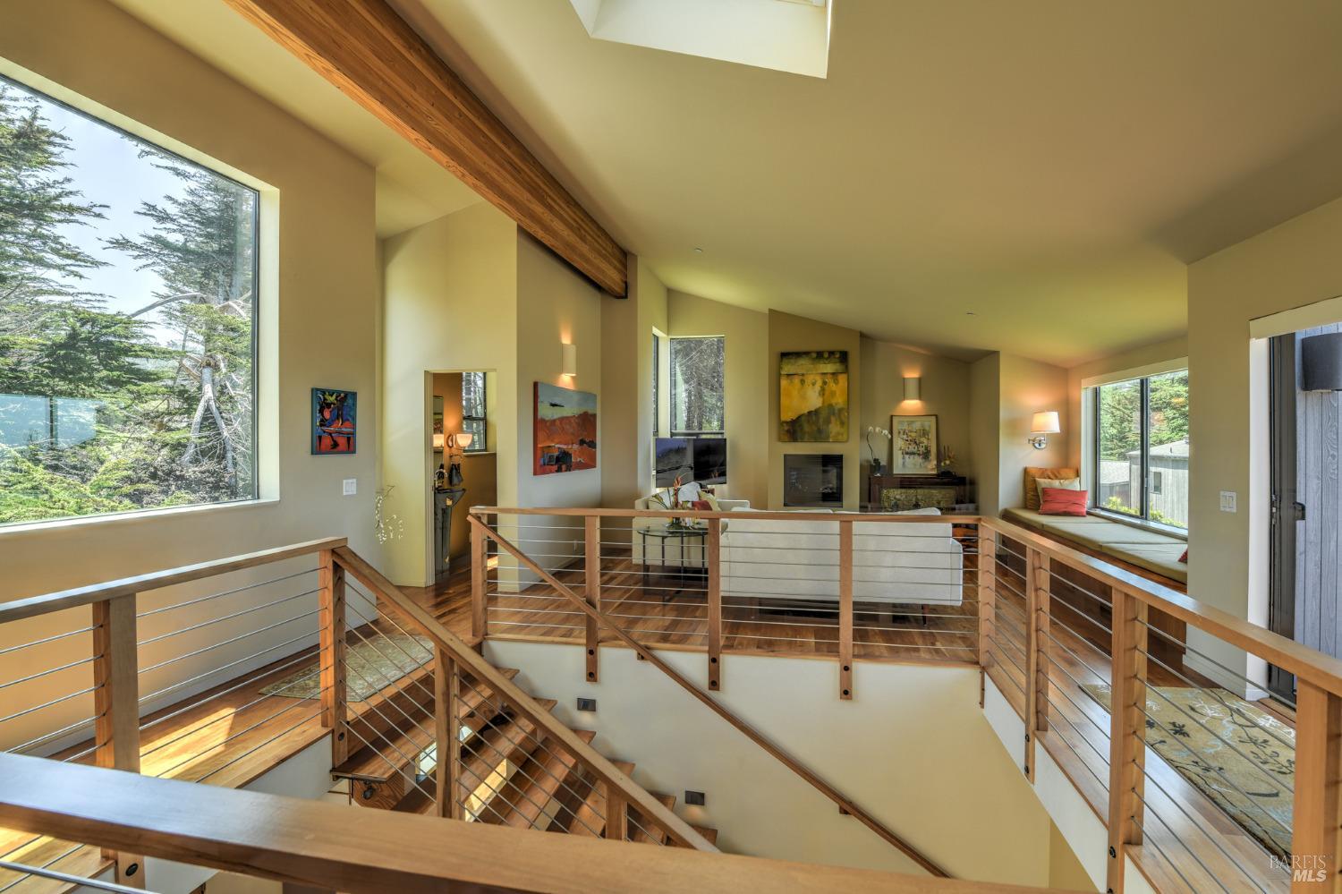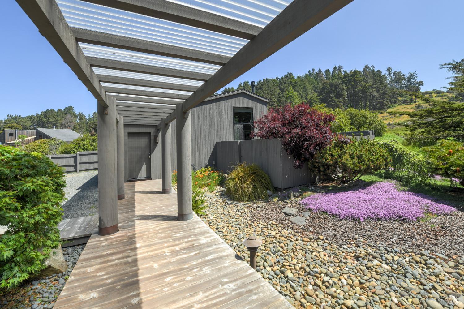 This stunning and meticulous 2 en-suite bedrooms, Brodie designed home is an architectural masterpiece. From the moment you walk down the private entrance path, enter the lovely glass front door, you are greeted by a lovely rock garden, a sweeping ocean view, and a striking contemporary open staircase. Two private en-suites are sited on each side of this entrance and provide space, light and gas fireplaces which contribute to a warm and welcoming ambience. The upper floor Great Room accentuates this level of detail and aesthetic, where large windows, sliding doors to a private deck, built in window seats all lend itself to a coastal experience where ocean, forest and sunset views dominate your visual sphere. The chef's kitchen houses the finest in cabinetry and appliance choice and a huge window captures magnificent forest views to the east. A separate studio space entertains many possibilities - guest room, music room, artist studio. A tranquil escape from city life, this unique Sea Ranch home offers exceptional full time living, vacation rental potential, and 2nd home enjoyment where hiking, whale watching, cooking, reading, and sunsets abound, where ending the day relaxing in a private outdoor spa, watching the stars and listening to the sea is as good as it gets.