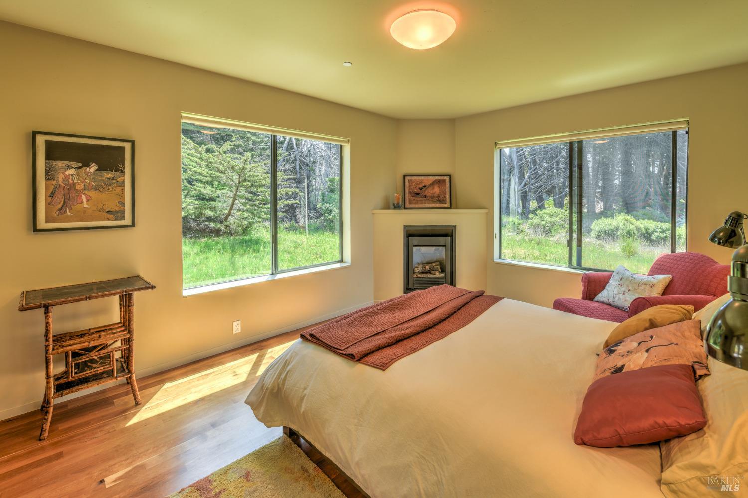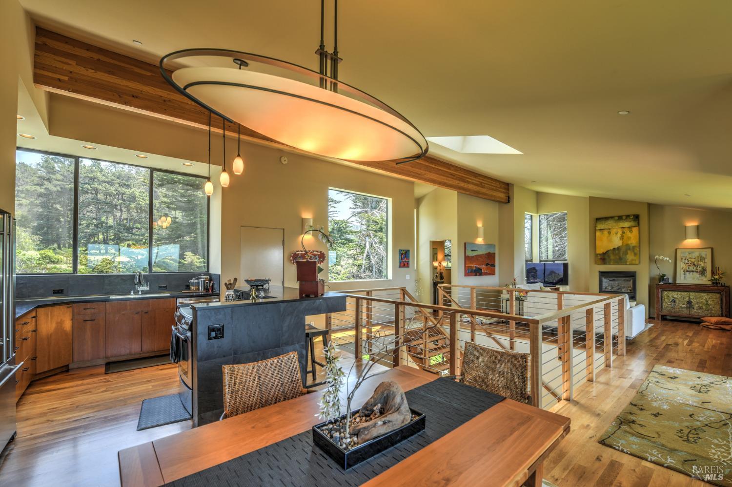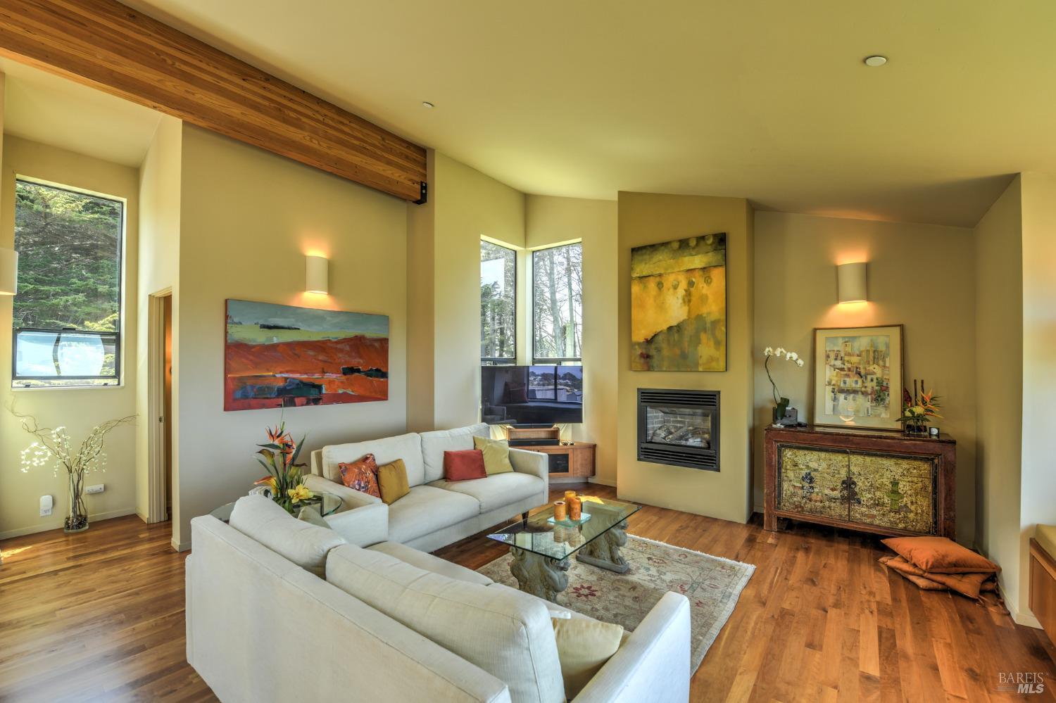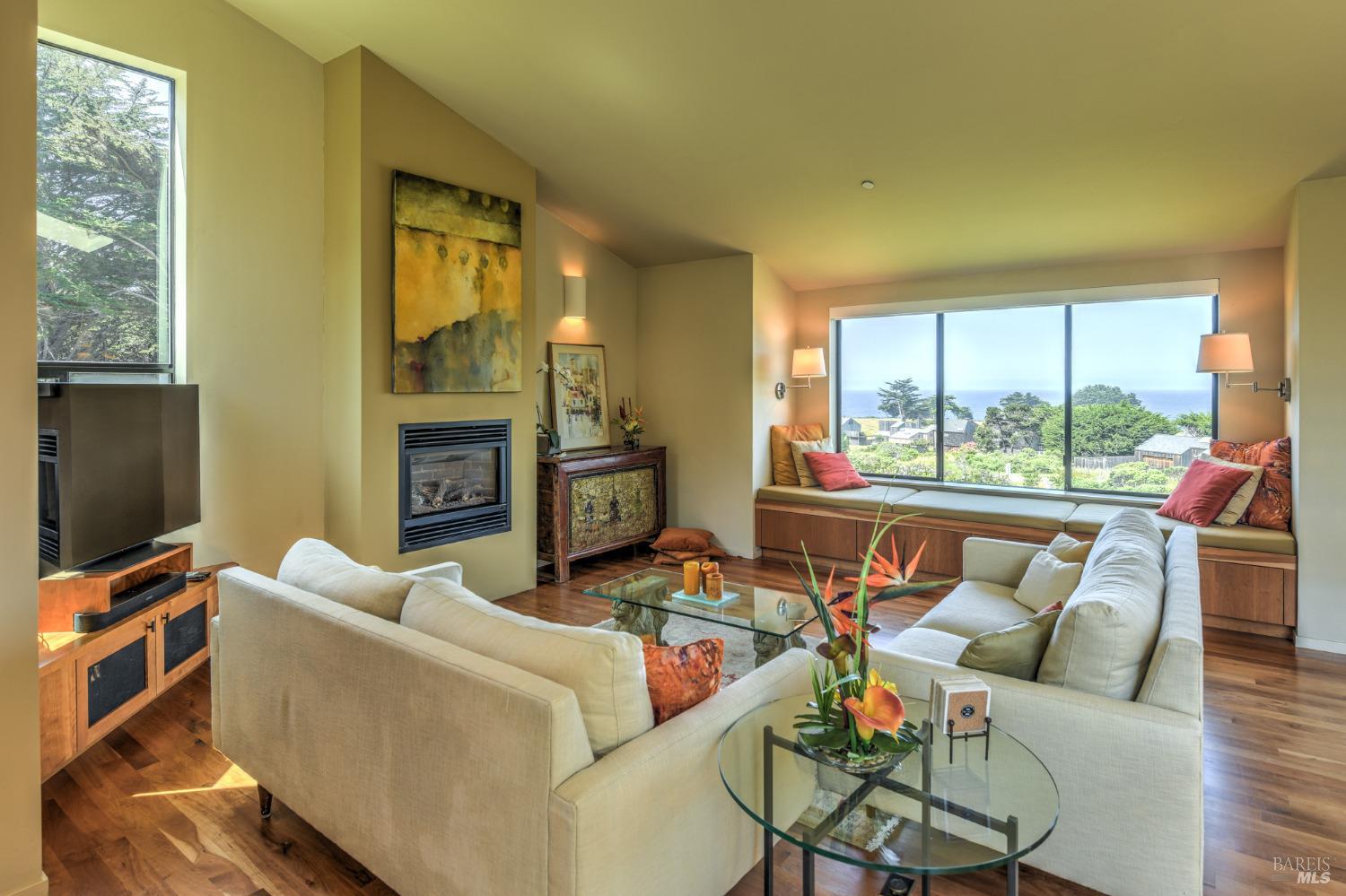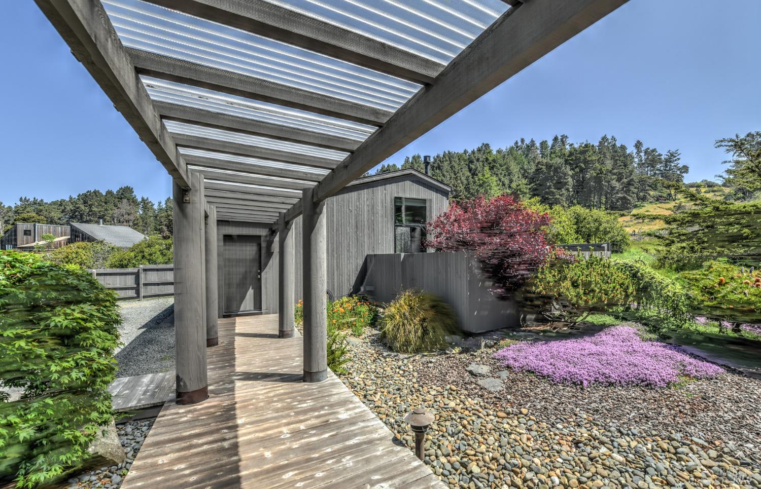 This stunning and meticulous 2 en-suite bedrooms, Brodie designed home is an architectural masterpiece. From the moment you walk down the private entrance path, enter the lovely glass front door, you are greeted by a lovely rock garden, a sweeping ocean view, and a striking contemporary open staircase. Two private en-suites are sited on each side of this entrance and provide space, light and gas fireplaces which contribute to a warm and welcoming ambience. The upper floor Great Room accentuates this level of detail and aesthetic, where large windows, sliding doors to a private deck, built in window seats all lend itself to a coastal experience where ocean, forest and sunset views dominate your visual sphere. The chef's kitchen houses the finest in cabinetry and appliance choice and a huge window captures magnificent forest views to the east. A separate studio space entertains many possibilities - guest room, music room, artist studio. A tranquil escape from city life, this unique Sea Ranch home offers exceptional full time living, vacation rental potential, and 2nd home enjoyment where hiking, whale watching, cooking, reading, and sunsets abound, where ending the day relaxing in a private outdoor spa, watching the stars and listening to the sea is as good as it gets.