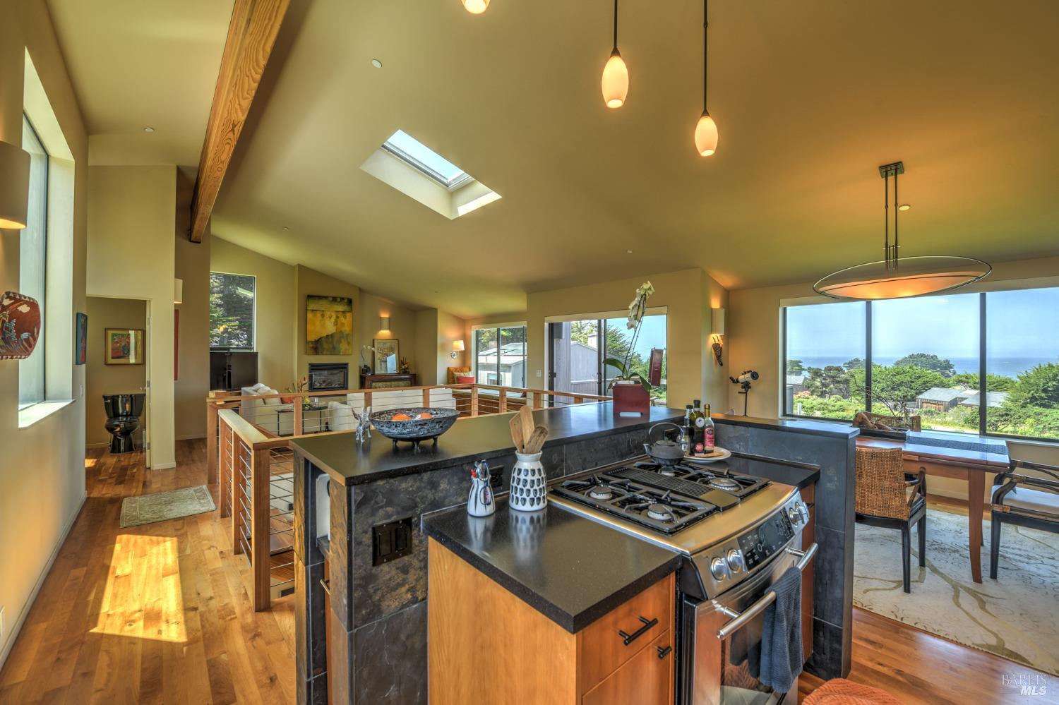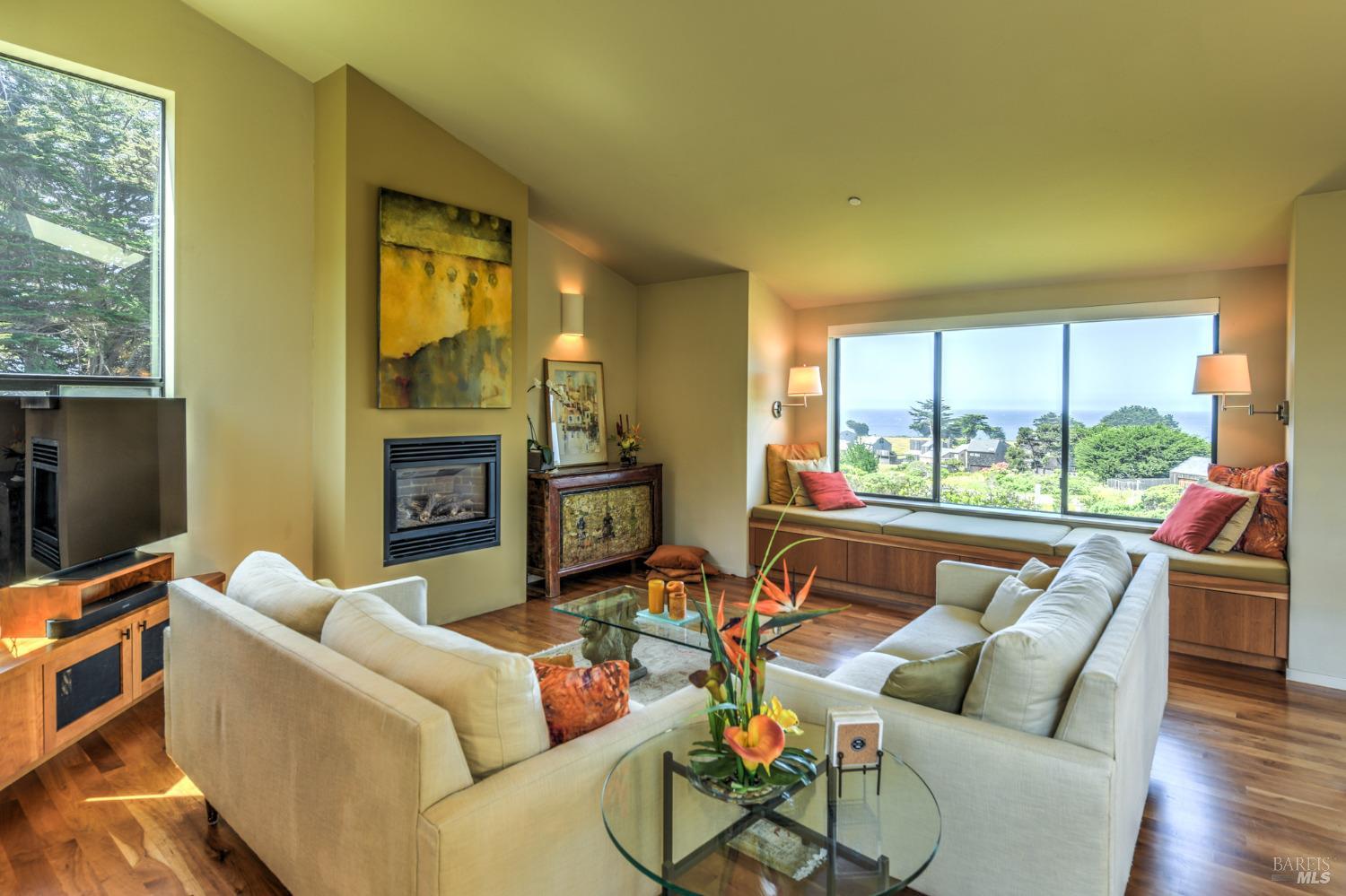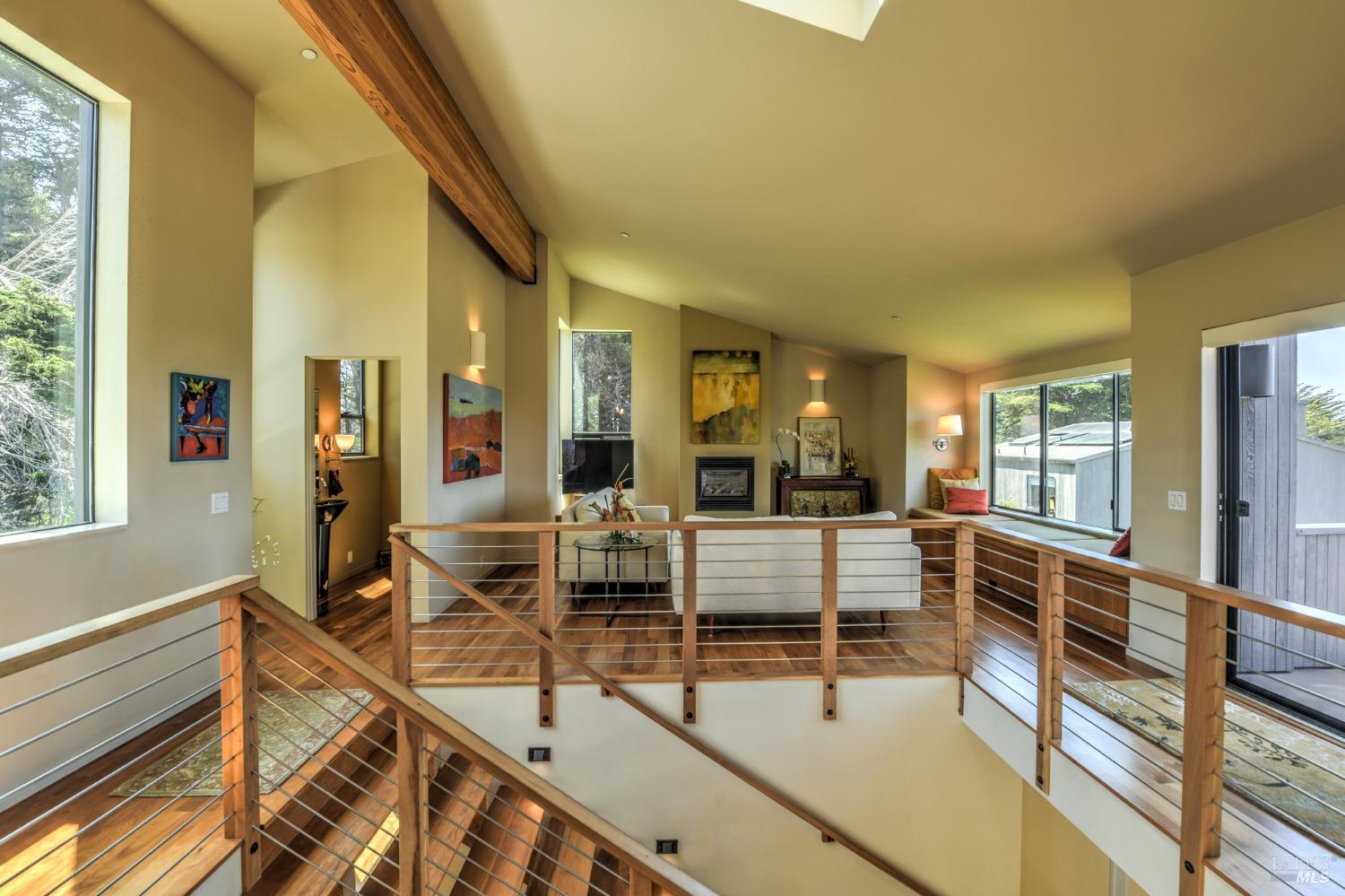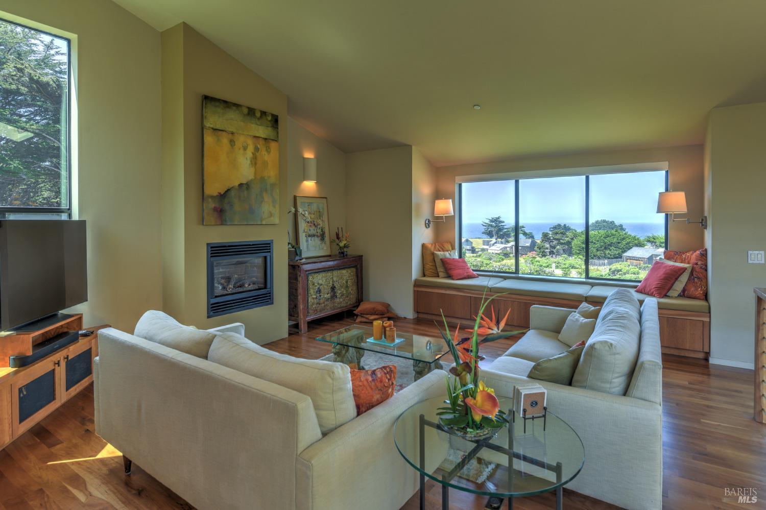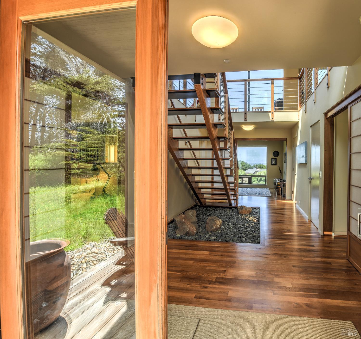 This stunning and meticulous 2 en-suite bedrooms, Brodie designed home is an architectural masterpiece. From the moment you walk down the private entrance path, enter the lovely glass front door, you are greeted by a lovely rock garden, a sweeping ocean view, and a striking contemporary open staircase. Two private en-suites are sited on each side of this entrance and provide space, light and gas fireplaces which contribute to a warm and welcoming ambience. The upper floor Great Room accentuates this level of detail and aesthetic, where large windows, sliding doors to a private deck, built in window seats all lend itself to a coastal experience where ocean, forest and sunset views dominate your visual sphere. The chef's kitchen houses the finest in cabinetry and appliance choice and a huge window captures magnificent forest views to the east. A separate studio space entertains many possibilities - guest room, music room, artist studio. A tranquil escape from city life, this unique Sea Ranch home offers exceptional full time living, vacation rental potential, and 2nd home enjoyment where hiking, whale watching, cooking, reading, and sunsets abound, where ending the day relaxing in a private outdoor spa, watching the stars and listening to the sea is as good as it gets.