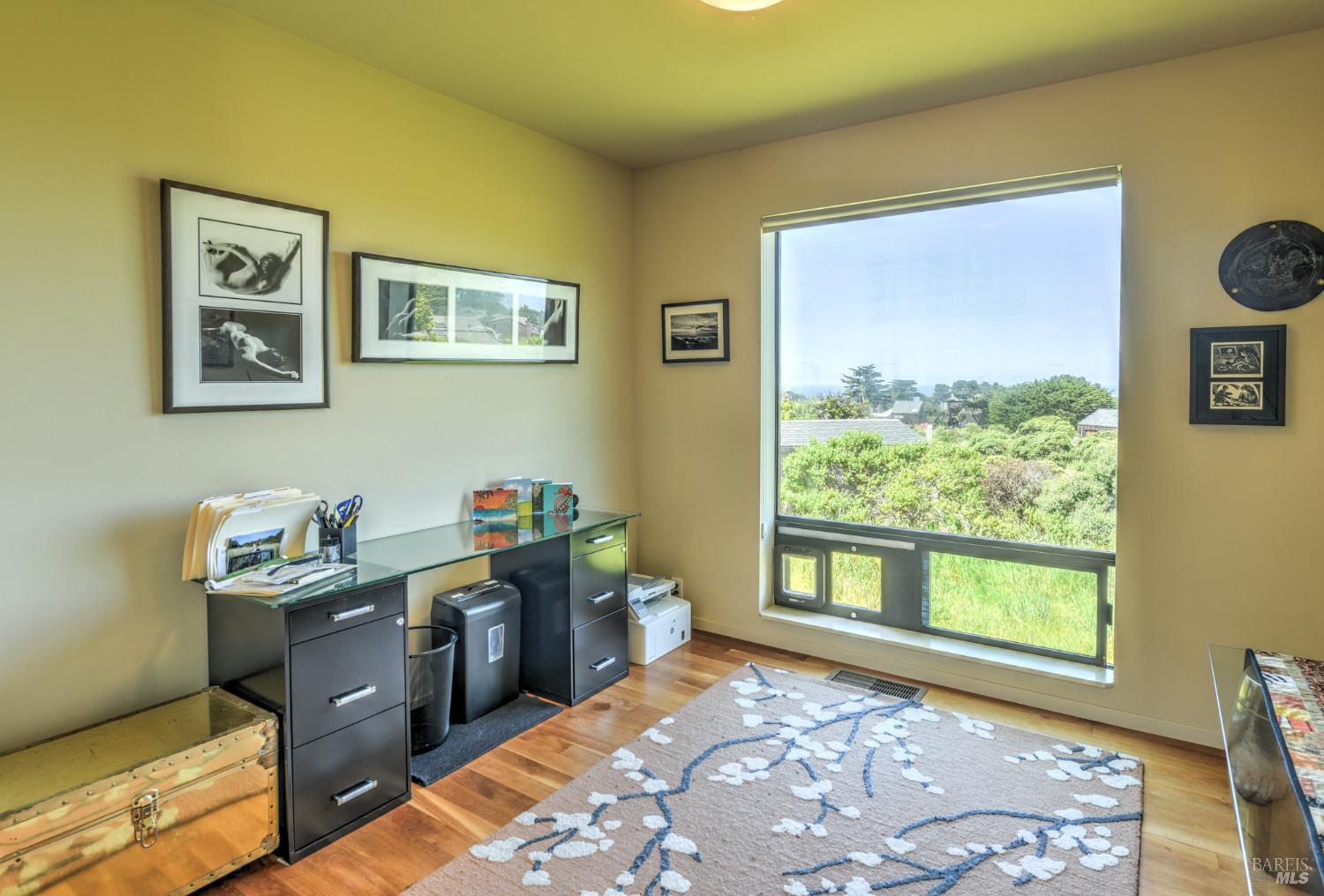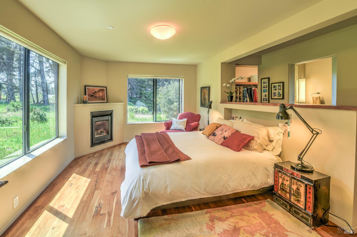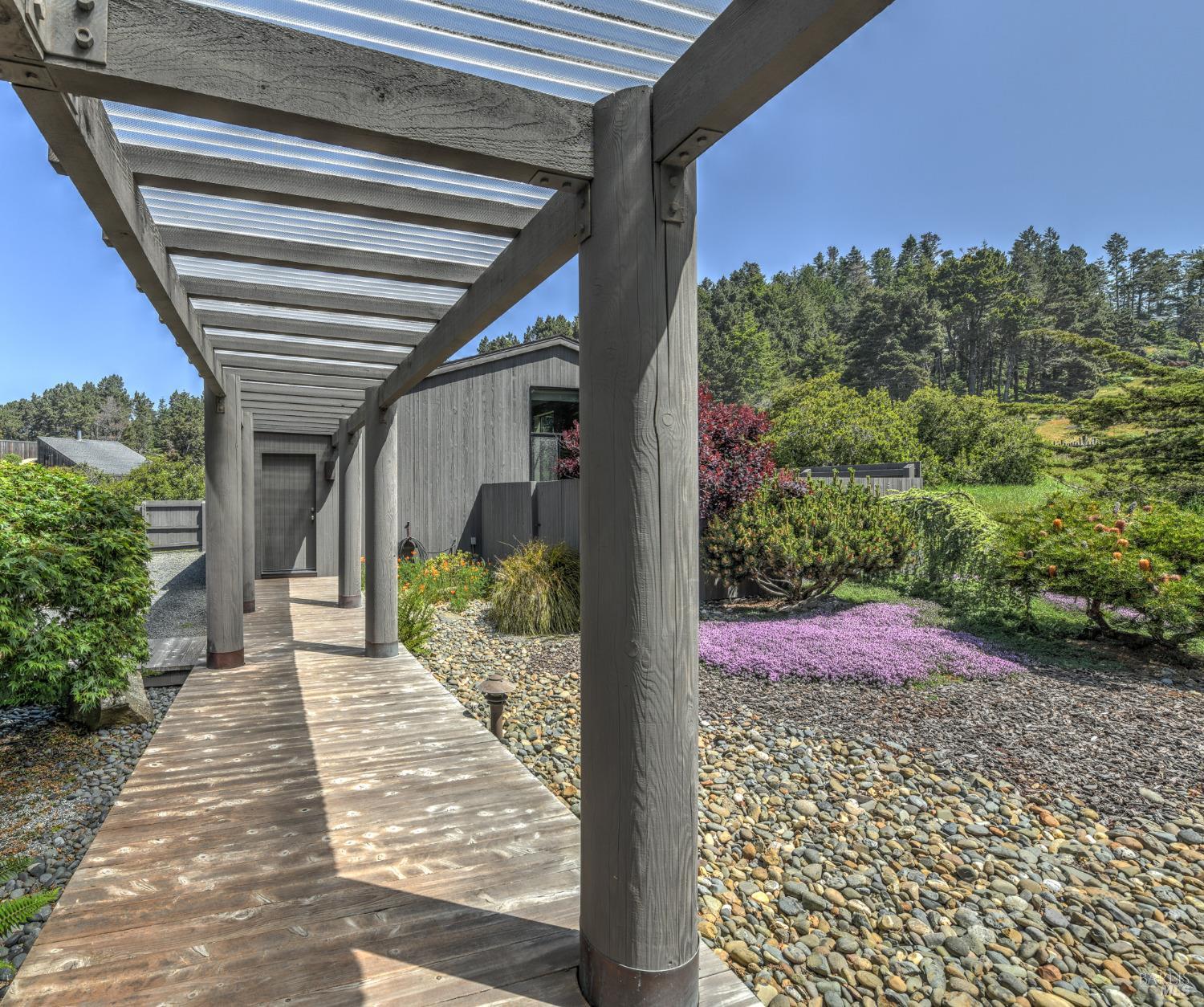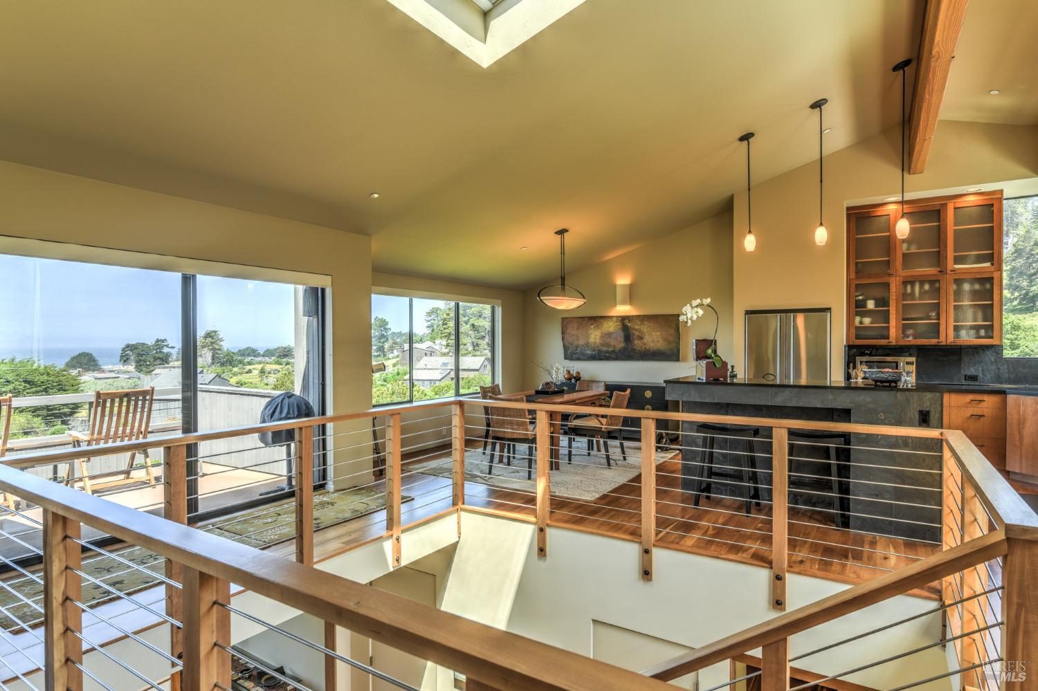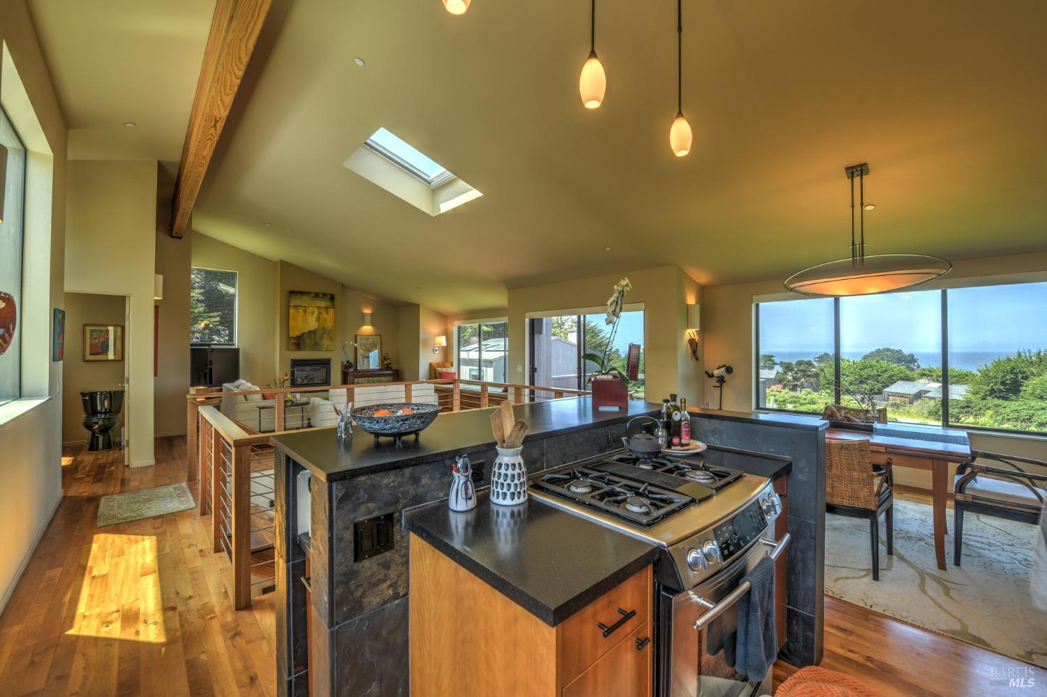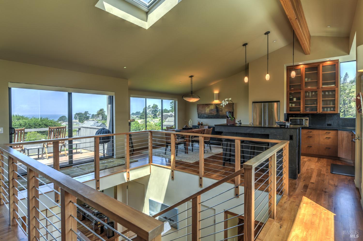 This stunning and meticulous 2 en-suite bedrooms, Brodie designed home is an architectural masterpiece. From the moment you walk down the private entrance path, enter the lovely glass front door, you are greeted by a lovely rock garden, a sweeping ocean view, and a striking contemporary open staircase. Two private en-suites are sited on each side of this entrance and provide space, light and gas fireplaces which contribute to a warm and welcoming ambience. The upper floor Great Room accentuates this level of detail and aesthetic, where large windows, sliding doors to a private deck, built in window seats all lend itself to a coastal experience where ocean, forest and sunset views dominate your visual sphere. The chef's kitchen houses the finest in cabinetry and appliance choice and a huge window captures magnificent forest views to the east. A separate studio space entertains many possibilities - guest room, music room, artist studio. A tranquil escape from city life, this unique Sea Ranch home offers exceptional full time living, vacation rental potential, and 2nd home enjoyment where hiking, whale watching, cooking, reading, and sunsets abound, where ending the day relaxing in a private outdoor spa, watching the stars and listening to the sea is as good as it gets.