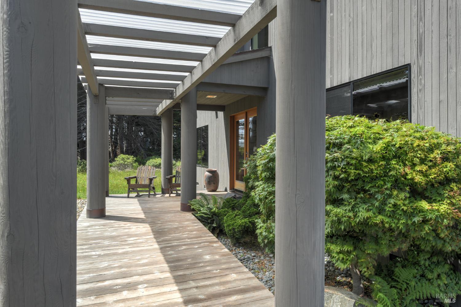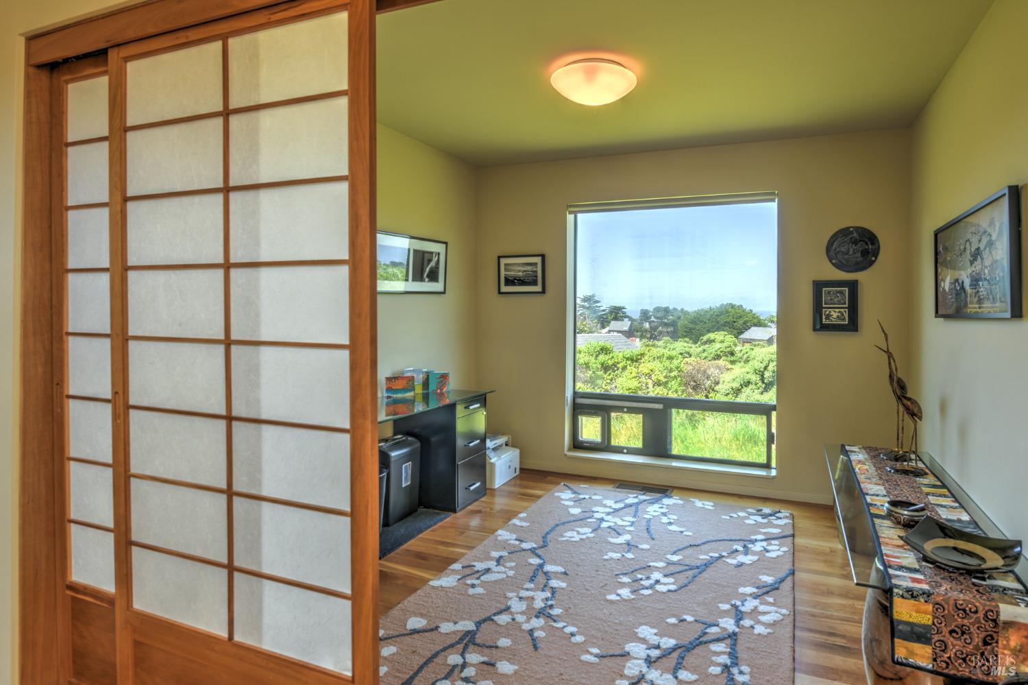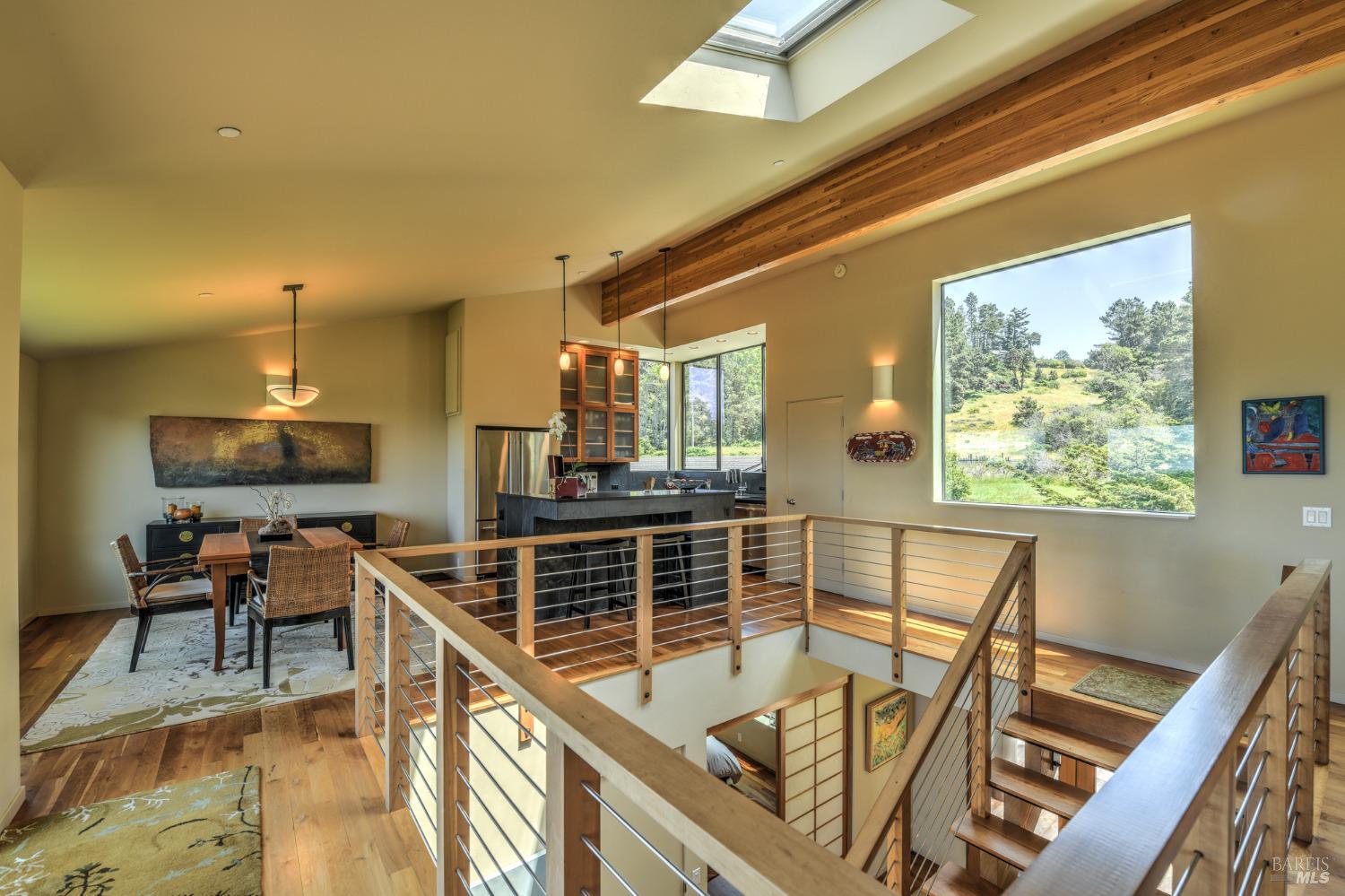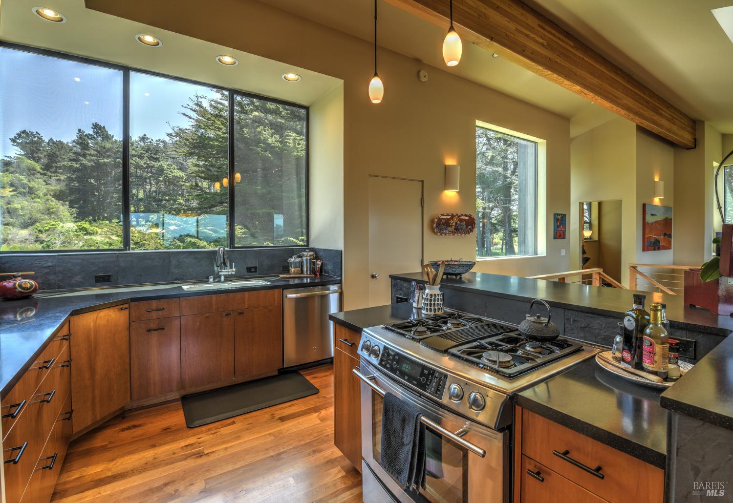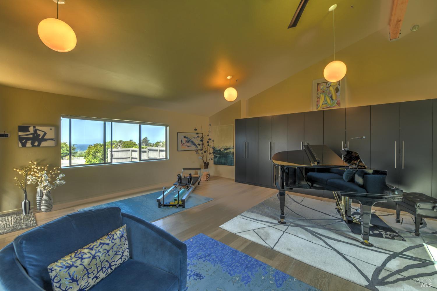 This stunning and meticulous 2 en-suite bedrooms, Brodie designed home is an architectural masterpiece. From the moment you walk down the private entrance path, enter the lovely glass front door, you are greeted by a lovely rock garden, a sweeping ocean view, and a striking contemporary open staircase. Two private en-suites are sited on each side of this entrance and provide space, light and gas fireplaces which contribute to a warm and welcoming ambience. The upper floor Great Room accentuates this level of detail and aesthetic, where large windows, sliding doors to a private deck, built in window seats all lend itself to a coastal experience where ocean, forest and sunset views dominate your visual sphere. The chef's kitchen houses the finest in cabinetry and appliance choice and a huge window captures magnificent forest views to the east. A separate studio space entertains many possibilities - guest room, music room, artist studio. A tranquil escape from city life, this unique Sea Ranch home offers exceptional full time living, vacation rental potential, and 2nd home enjoyment where hiking, whale watching, cooking, reading, and sunsets abound, where ending the day relaxing in a private outdoor spa, watching the stars and listening to the sea is as good as it gets.