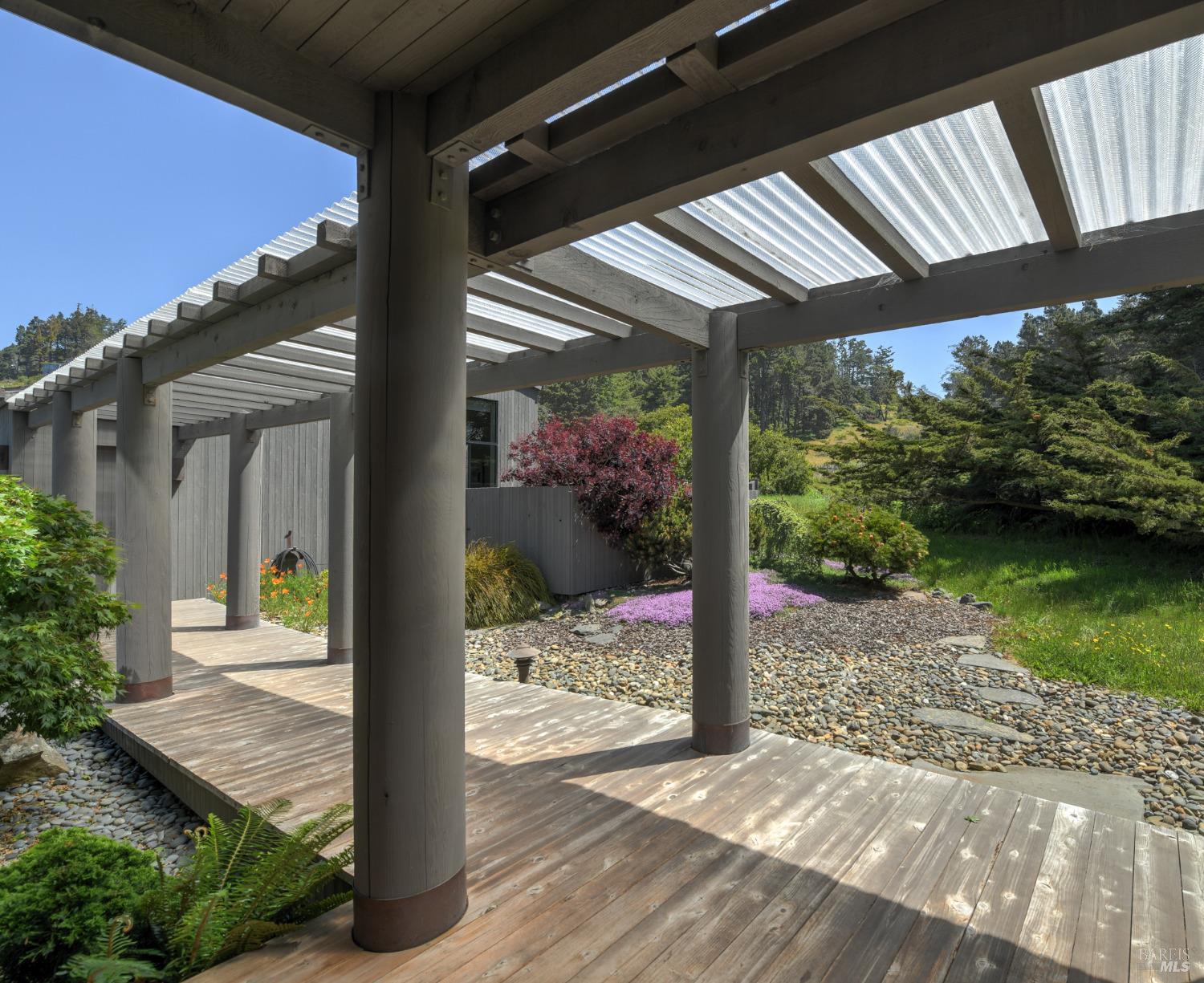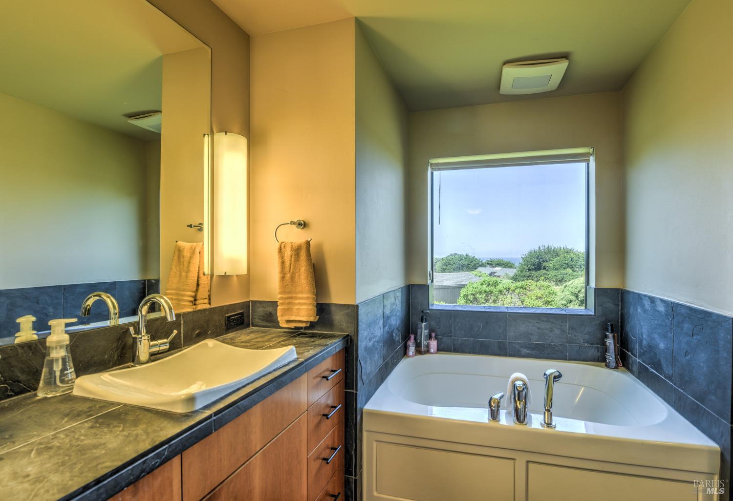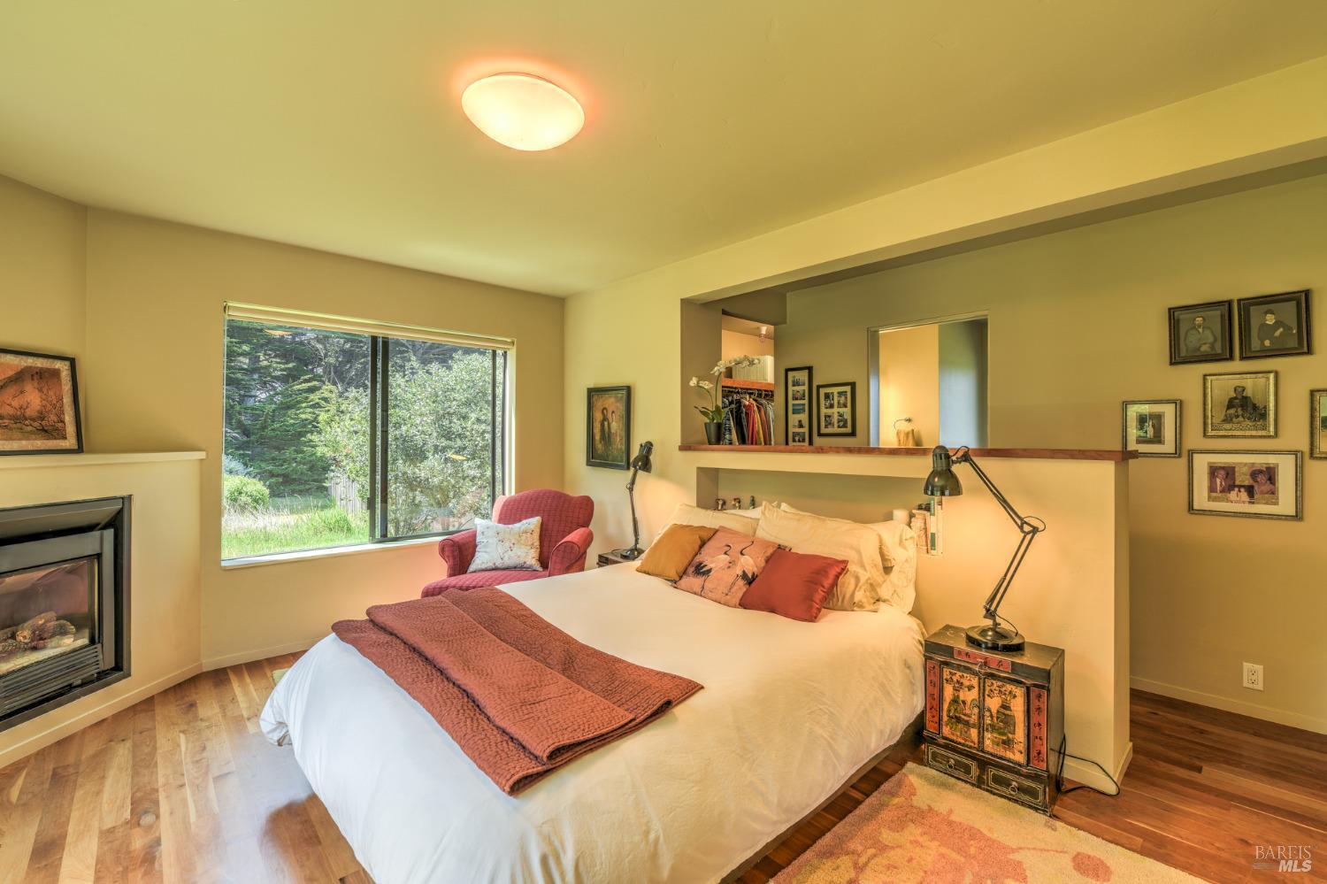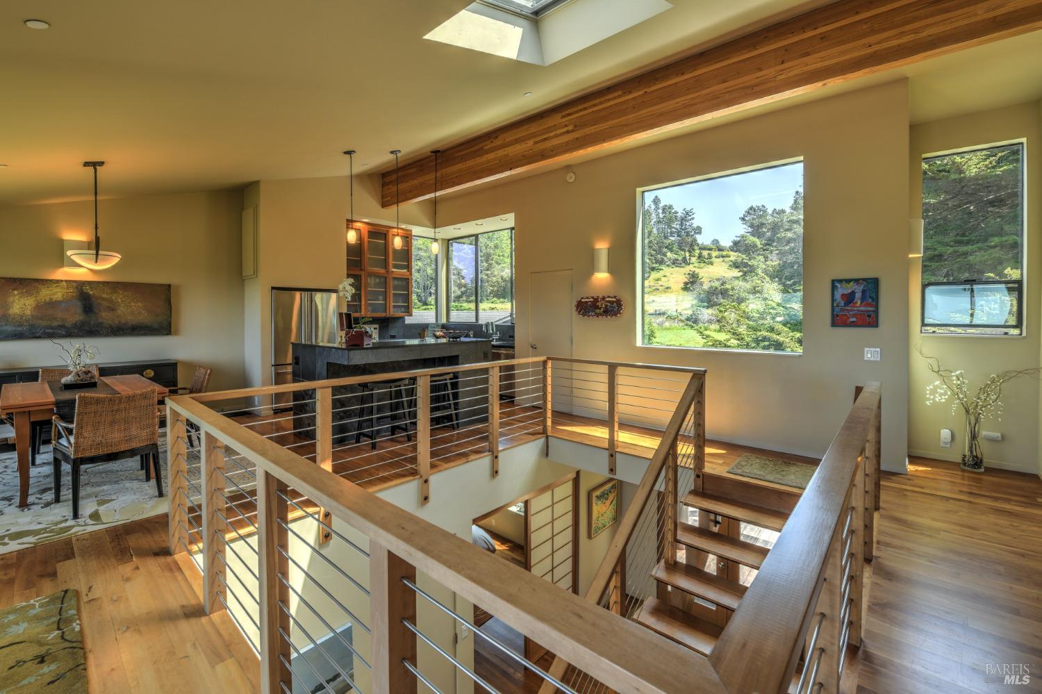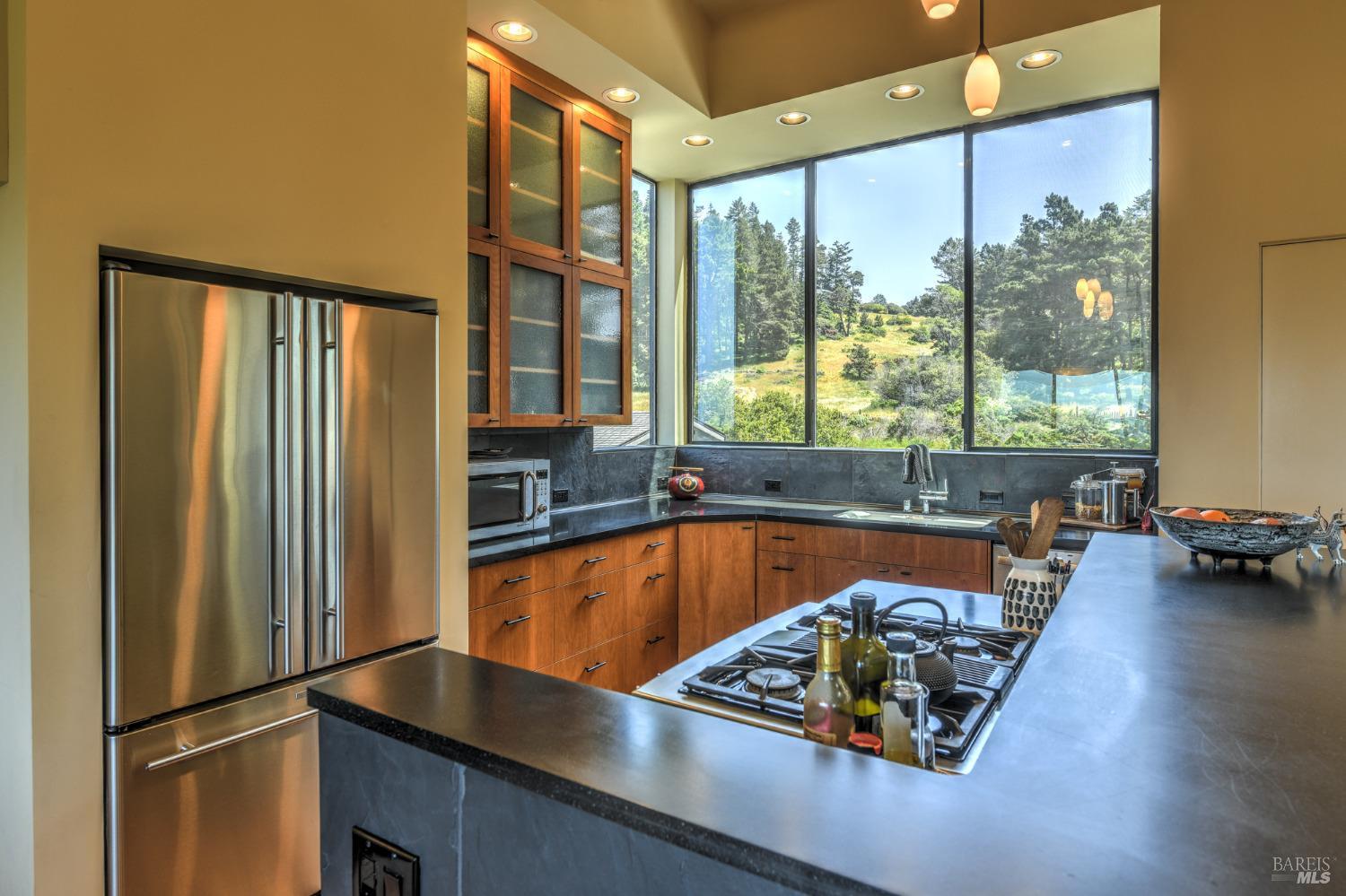 This stunning and meticulous 2 en-suite bedrooms, Brodie designed home is an architectural masterpiece. From the moment you walk down the private entrance path, enter the lovely glass front door, you are greeted by a lovely rock garden, a sweeping ocean view, and a striking contemporary open staircase. Two private en-suites are sited on each side of this entrance and provide space, light and gas fireplaces which contribute to a warm and welcoming ambience. The upper floor Great Room accentuates this level of detail and aesthetic, where large windows, sliding doors to a private deck, built in window seats all lend itself to a coastal experience where ocean, forest and sunset views dominate your visual sphere. The chef's kitchen houses the finest in cabinetry and appliance choice and a huge window captures magnificent forest views to the east. A separate studio space entertains many possibilities - guest room, music room, artist studio. A tranquil escape from city life, this unique Sea Ranch home offers exceptional full time living, vacation rental potential, and 2nd home enjoyment where hiking, whale watching, cooking, reading, and sunsets abound, where ending the day relaxing in a private outdoor spa, watching the stars and listening to the sea is as good as it gets.